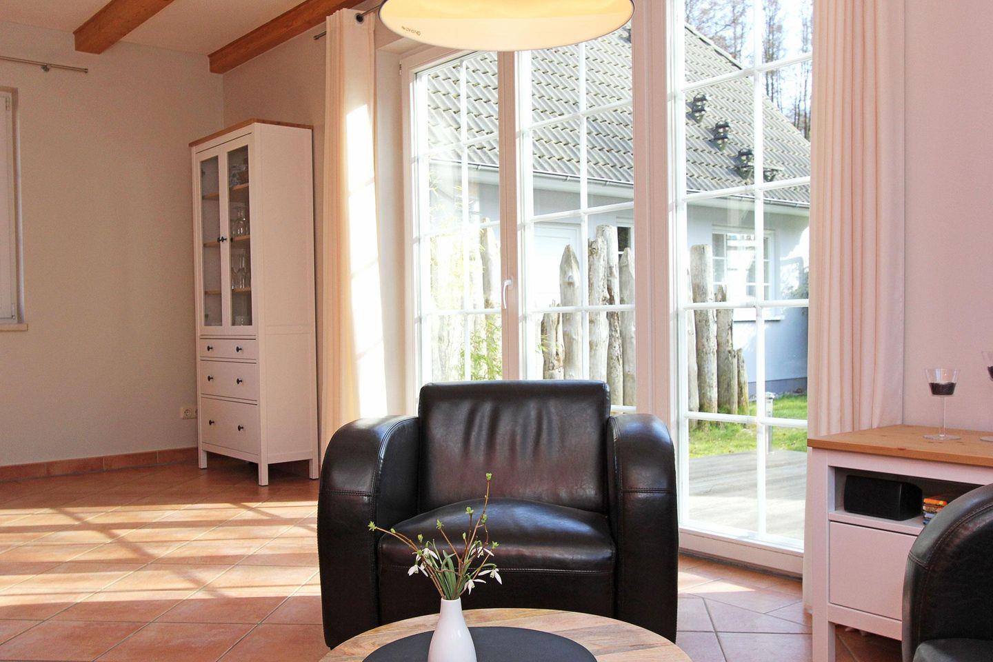 Das Ferienhaus verfügt über zwei Schlafzimmer. Das offene Wohnzimmer ist lichtdurchflutet und bietet eine gemütliche Atmosphäre, in der Sie sich sofort wohlfühlen werden. Ein offener Kamin sorgt für warme und romantische Abende, während Sie die Geselligkeit mit Ihren Liebsten genießen können. Die große Südterrasse lädt zum Verweilen und Entspannen ein.
