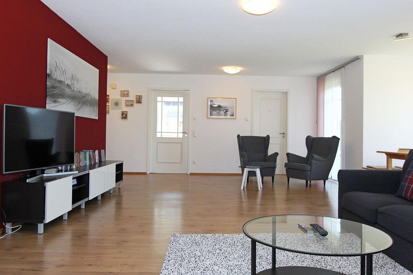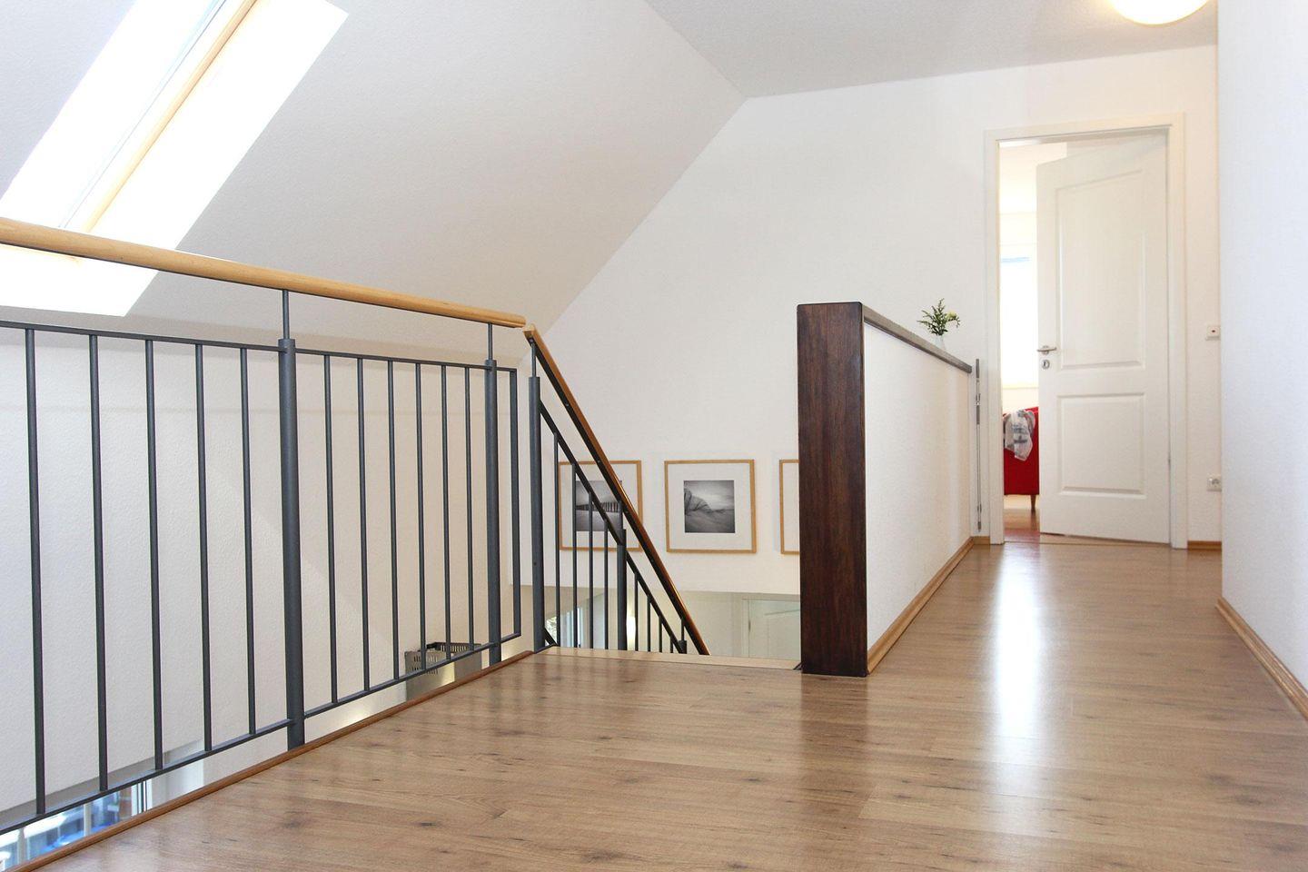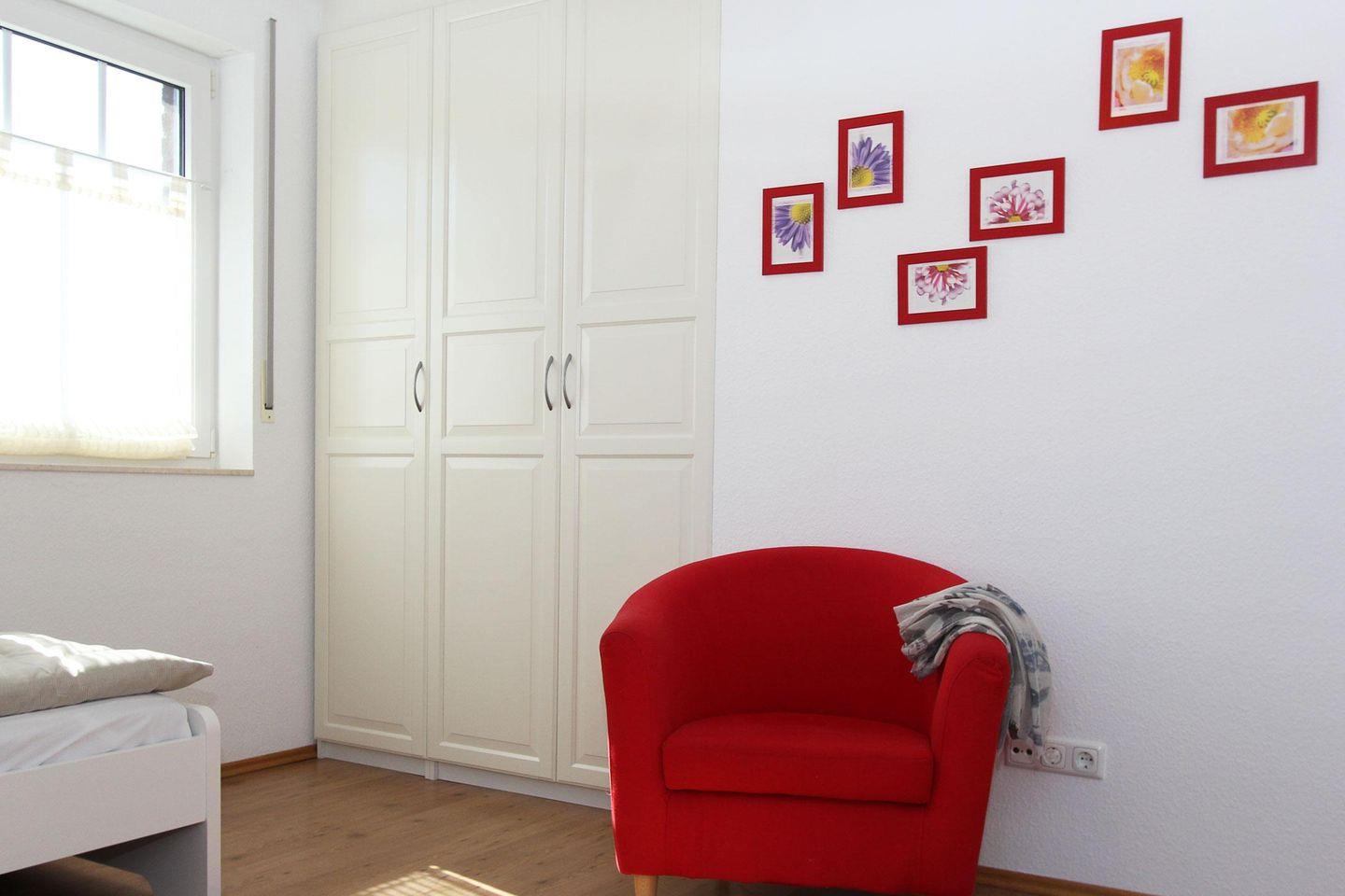 Im Obergeschoss befinden sich die drei Schlafräume, zwei davon sind ausgestattet mit je einem Doppelbett und einem großen Kleiderschrank, eines davon mit Fernseher und das dritte Zimmer mit zwei Einzelbetten.