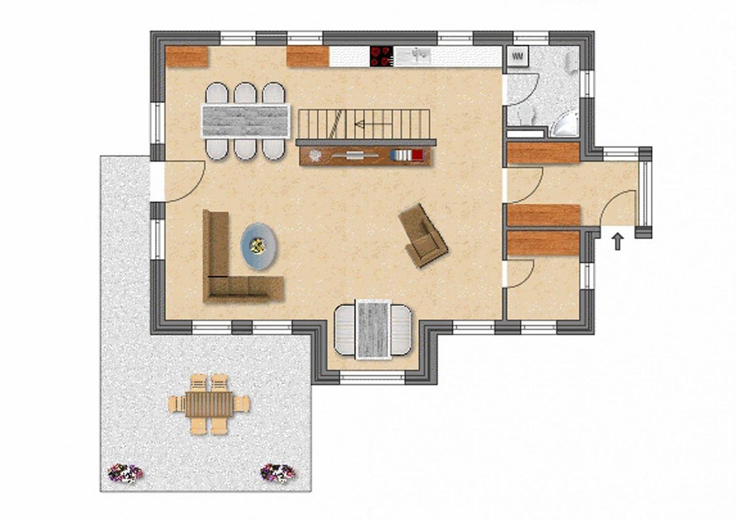 Vom Wohnbereich gelangt man auf die große Holzterrasse, auf der man im Sommer das Frühstück oder den Abend am Grill im Freien genießen kann. Auf den Sonnenliegen im Garten kann man die warmen Sonnenstunden genießen.