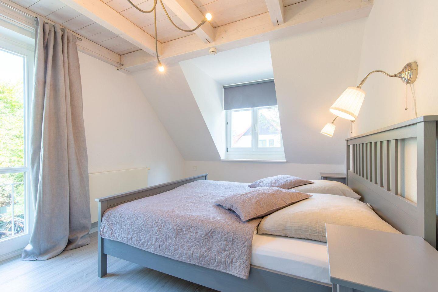 Auf dieser Etage befinden sich auch die zwei neu ausgestatteten Schlafzimmer mit je einem Doppelbett und Kleiderschrank, zum Teil nach oben offener, luftiger Decke und weißem Dachgebälk. Das Tageslicht-Badezimmer mit Dusche und Badewanne verfügt auch über eine Waschmaschine.