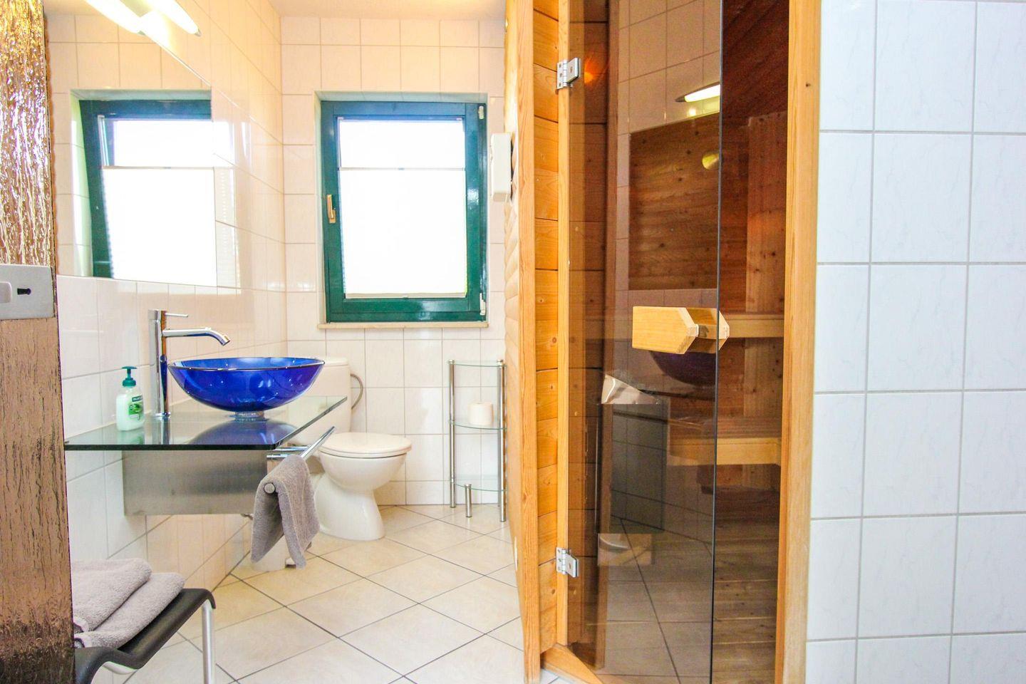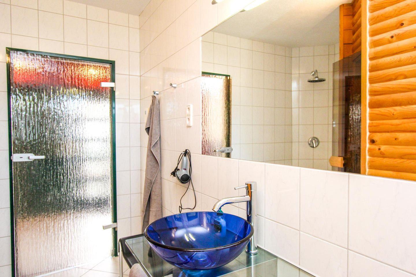 Das großzügige Badezimmer im Erdgeschoss verfügt über eine Dusche und Toilette und die angrenzende Sauna, die über einen Münzeinwurf verfügt. Die Laufzeit nach 2,00 € Münzeinwurf beträgt 20 Minuten. Zwei weiteren Personen steht im Obergeschoss ebenfalls ein Doppelbett zur Verfügung. Bitte beachten Sie: Das Haus Florida ist durch die offene Galerie und Treppe erst für Kinder ab 12 Jahren geeignet. Bei Reisen mit jüngeren Kindern, müsste eine Zusatzvereinbarung zum Haftungsausschluss unterzeichnet werden.