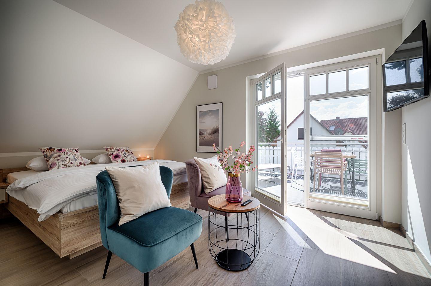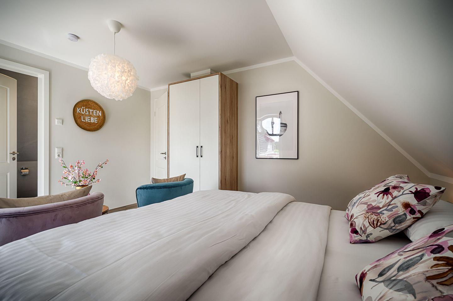 1 Schlafzimmer mit Doppelbett (1,80 x 2,00m) mit verstellbaren Lattenrosten, TV, eigenes Badezimmer mit Badewanne und WC, Zugang zur Dachterrasse