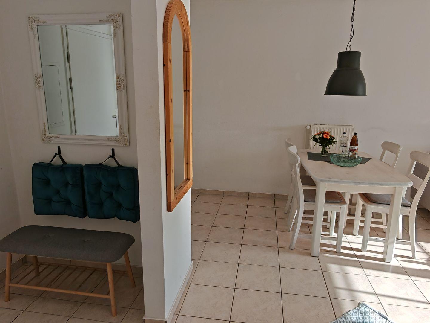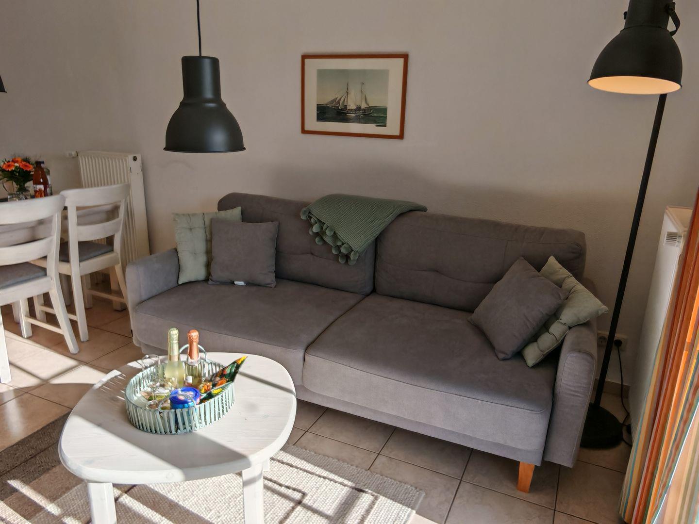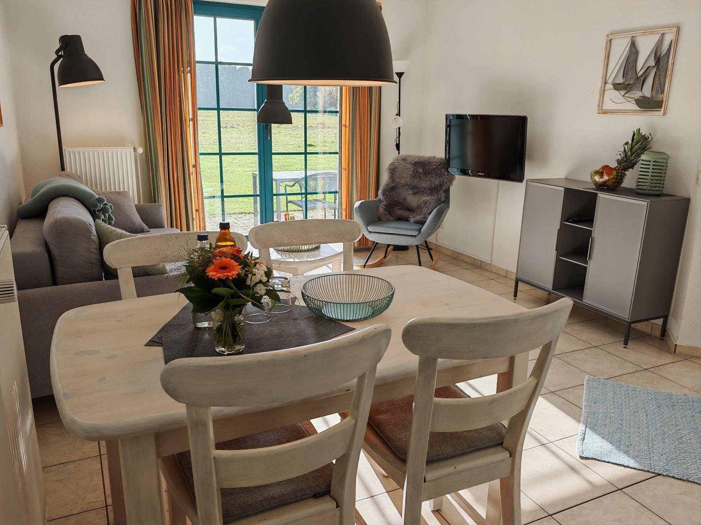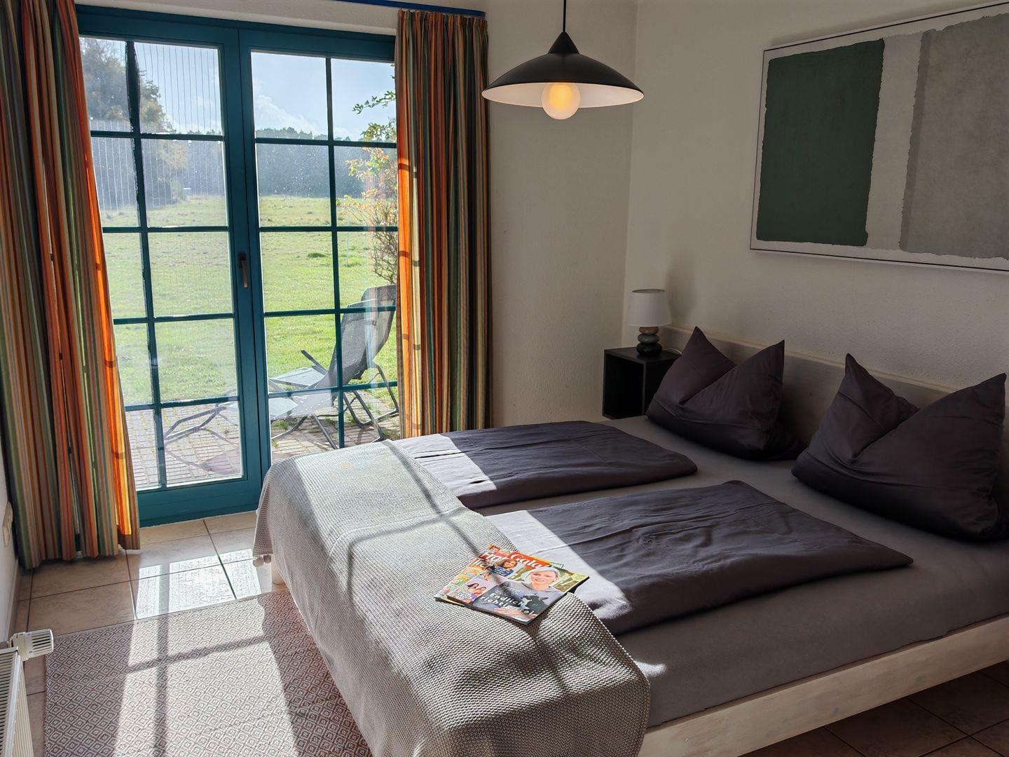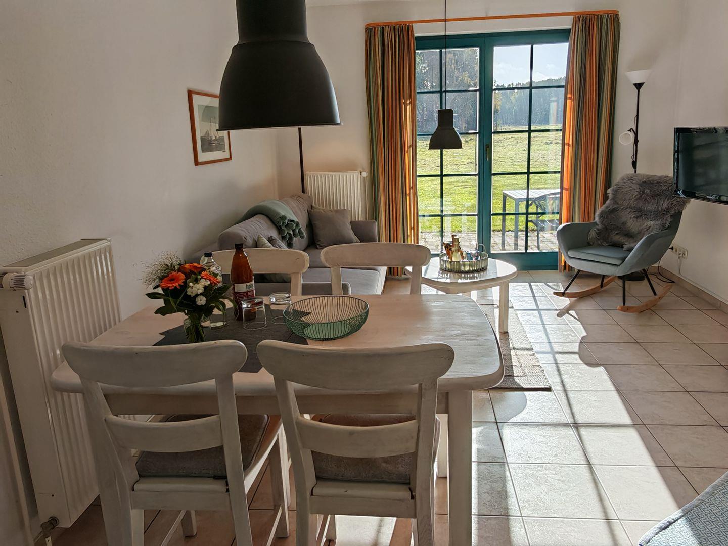 Willkommen in unserer 48-qm-Ferienwohnung! (ehemals "Börge") Natürliches Licht durchflutet Schlaf- und Wohnzimmer. Die geschmackvolle Einrichtung schafft eine besonders warme Atmosphäre. Im Wohnzimmer erwarten Sie ein komfortables Sofa und ein bequemer Sessel zum Entspannen. Das separate Schlafzimmer verspricht erholsame Nächte in harmonischem Ambiente. Die Besonderheit ist die nach Süden ausgerichtete Terrasse, von Wohn- und Schlafzimmer zugänglich, mit unverbautem Blick auf die grüne Wiese.