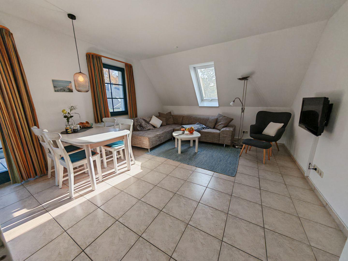 Willkommen in der Ferienanlage Capitän Christoph in unserer einladenden Ferienwohnung mit 52 Quadratmetern und einem sonnigen Südwestbalkon! Das Wohnzimmer bietet ein geräumiges Sofa, einen bequemen Sessel und einen TV für gemütliche Abende. Die offene Küche ist komplett ausgestattet und lädt zum gemeinsamen Kochen ein. Das Tageslichtbad sorgt für Frische und Helligkeit.