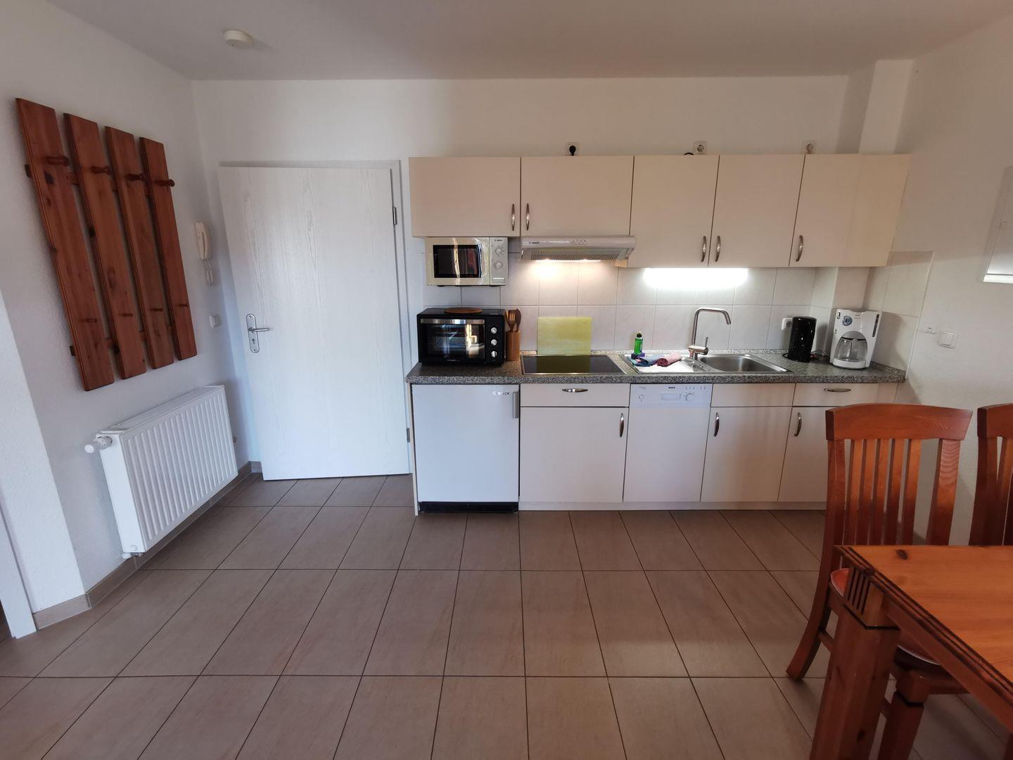 Die offene Küche ist modern und komplett ausgestattet. Massive Holzmöbel verleihen der Wohnung eine warme Atmosphäre. Im Wohnzimmer laden ein bequemes Sofa und Sessel zu entspannten Stunden ein. Hier können Sie den Flachbild-TV genießen, der auch im Schlafzimmer für Unterhaltung sorgt.