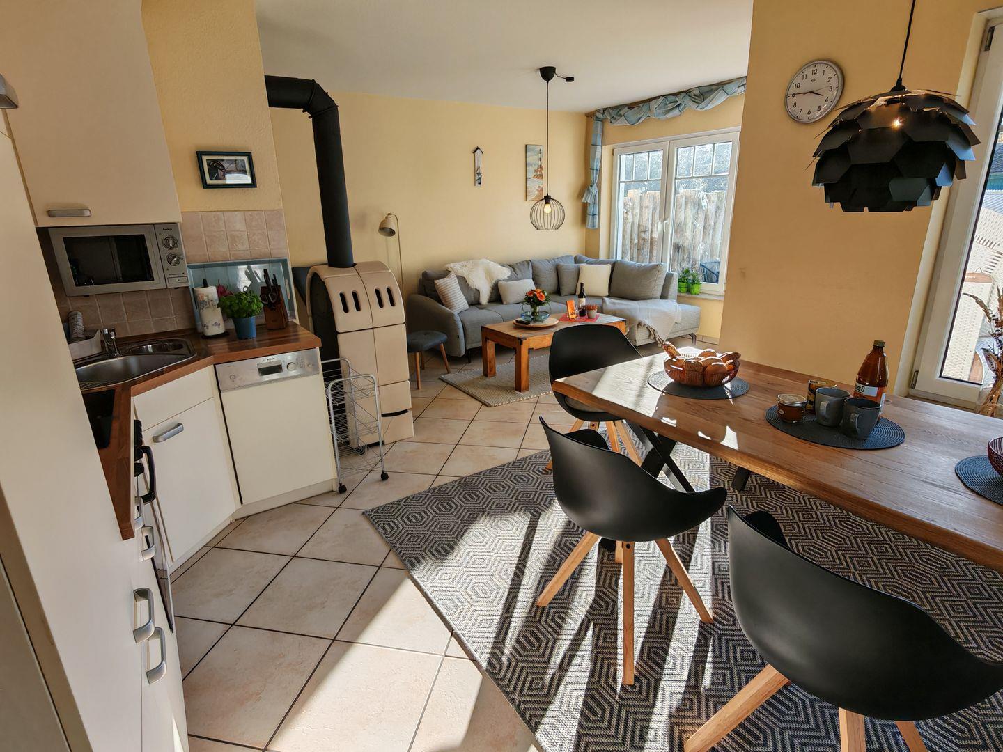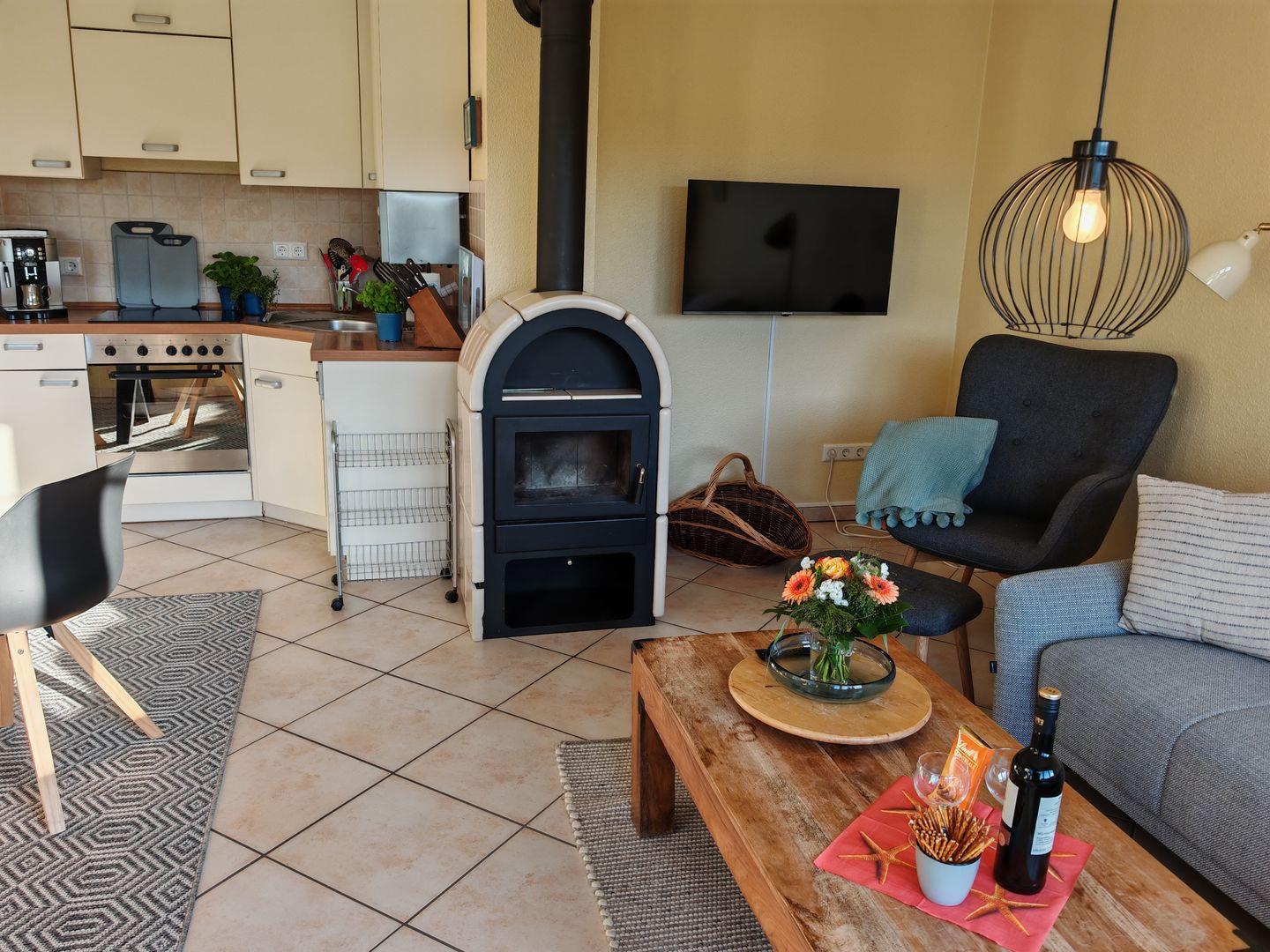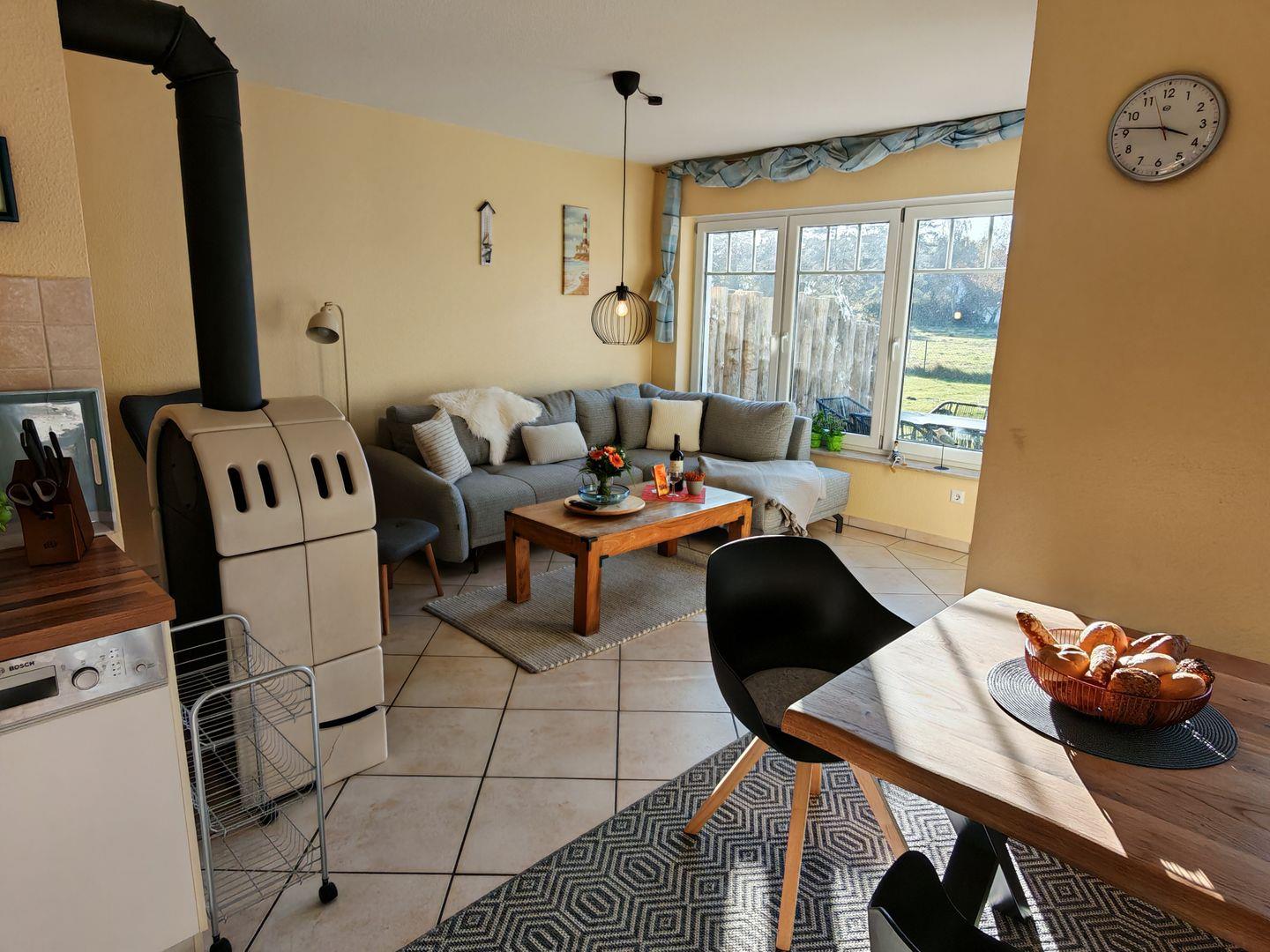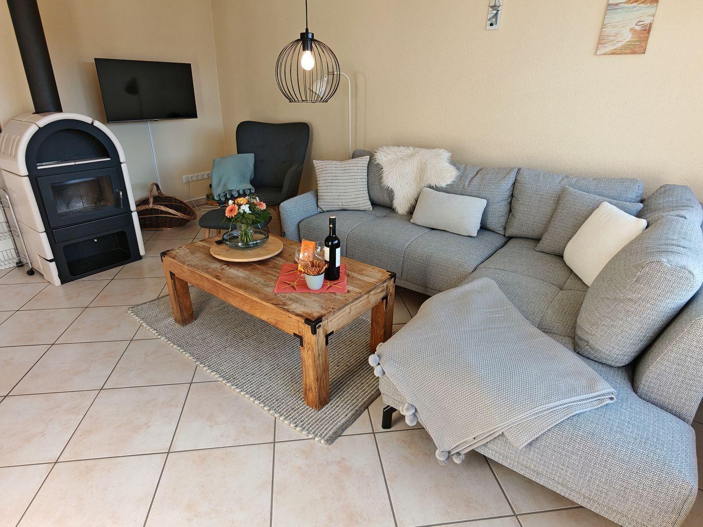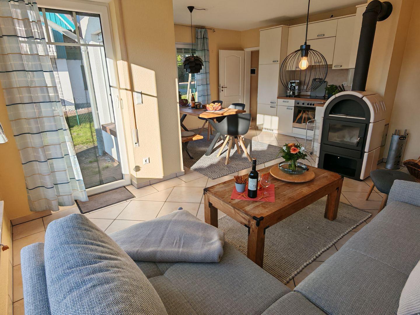 Im Erdgeschoss erwartet Sie ein großzügiger Wohnbereich mit einer offenen Küche, einem komfortablen Sofa und einem einladenden Kaminofen. Die offene Küche ist vollständig ausgestattet und bietet alles, was Sie für gemeinsame Kochabende benötigen. Der Kaminofen sorgt nicht nur für wohlige Wärme, sondern auch für eine gemütliche Atmosphäre an kühleren Abenden.