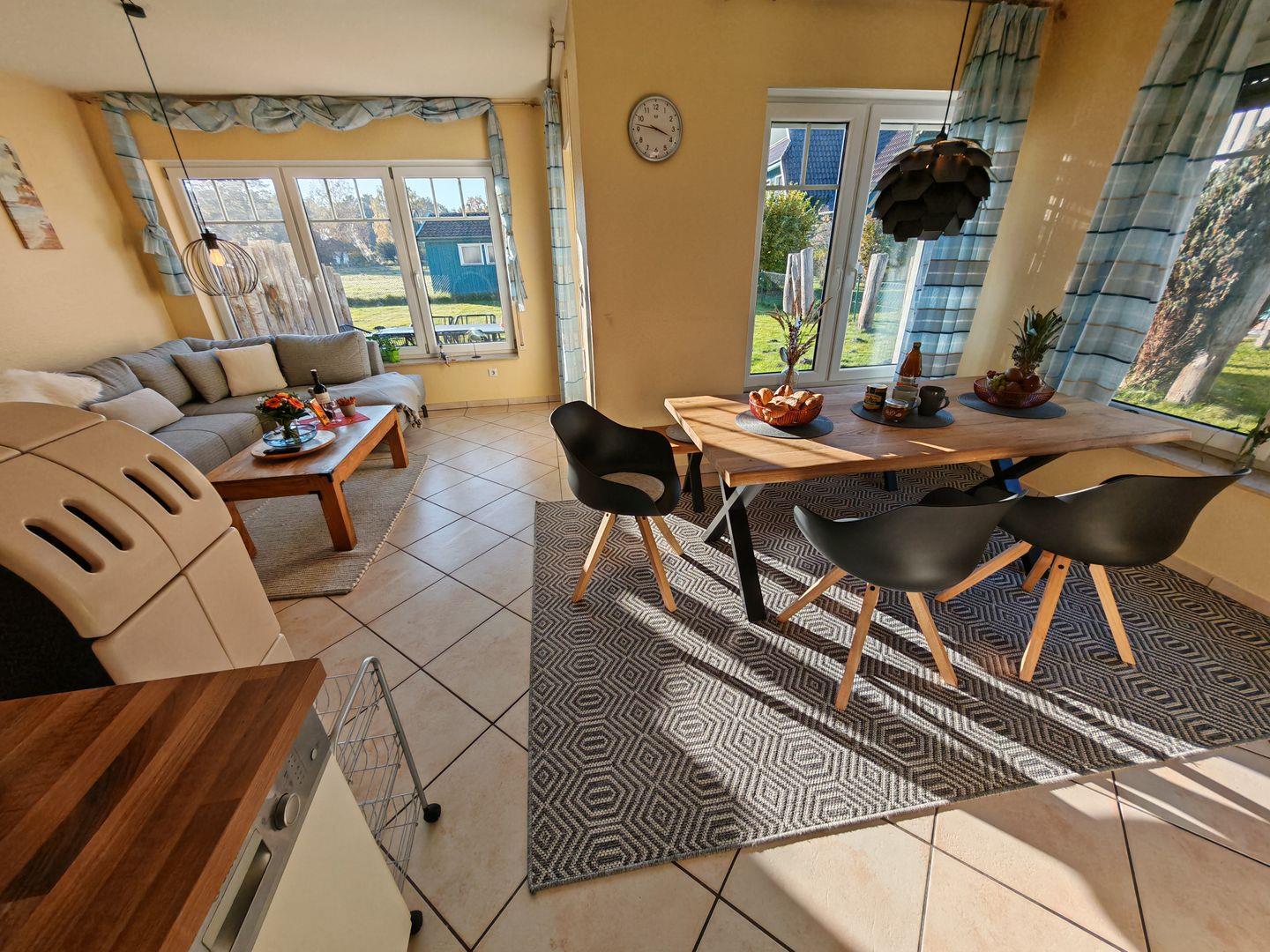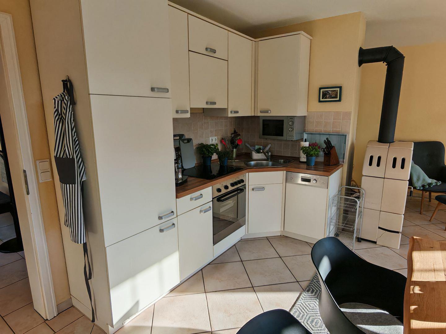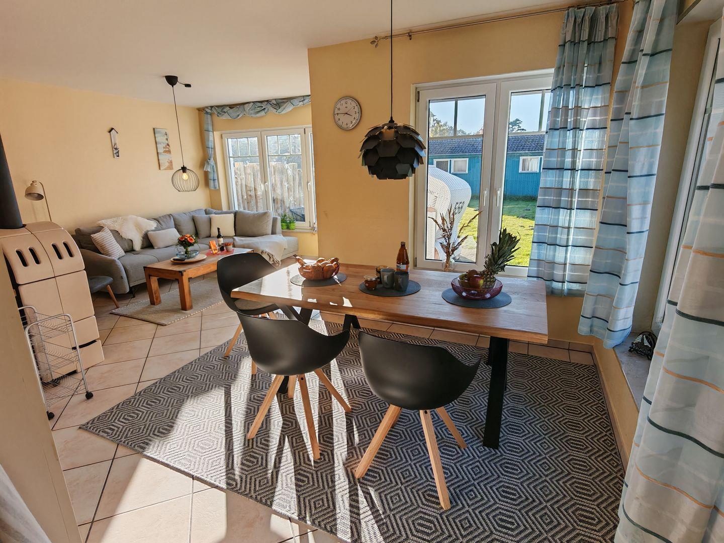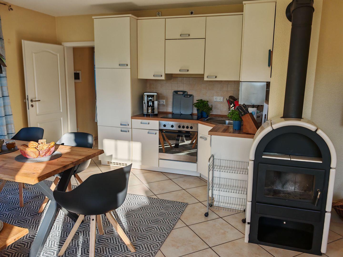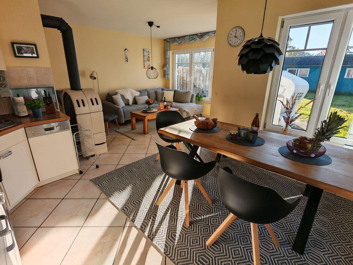Im Erdgeschoss erwartet Sie ein großzügiger Wohnbereich mit einer offenen Küche, einem komfortablen Sofa und einem einladenden Kaminofen. Die offene Küche ist vollständig ausgestattet und bietet alles, was Sie für gemeinsame Kochabende benötigen. Der Kaminofen sorgt nicht nur für wohlige Wärme, sondern auch für eine gemütliche Atmosphäre an kühleren Abenden.