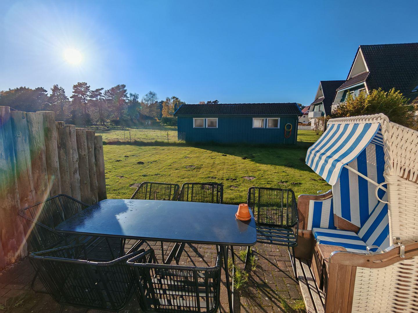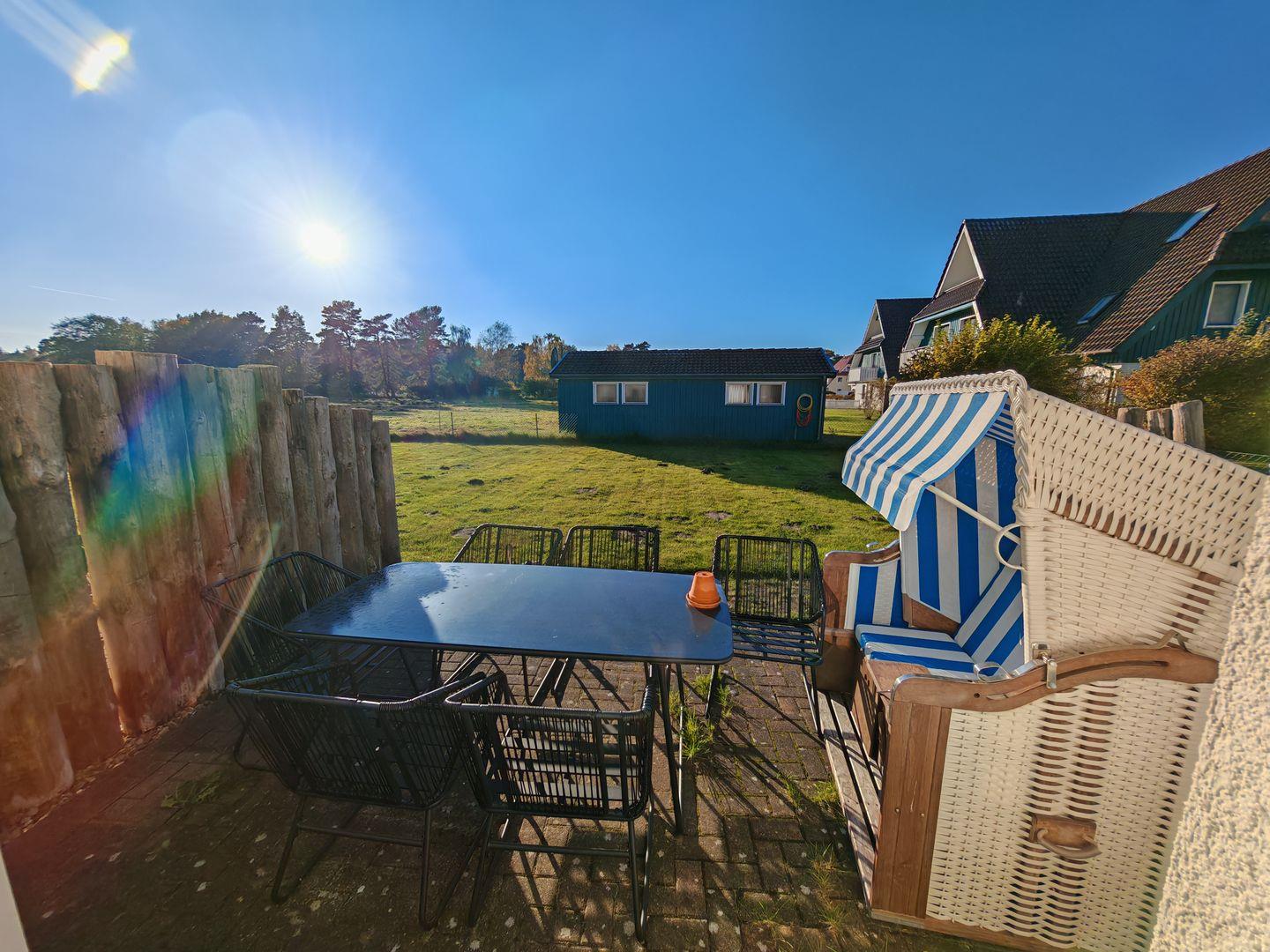Eine Südostterrasse erweitert den Wohnraum nach draußen. Hier können Sie unter freiem Himmel entspannen und den Ausblick auf die grüne Umgebung genießen. Die Terrasse ist mit bequemen Möbeln ausgestattet und bietet den idealen Rahmen für gesellige Stunden im Freien.