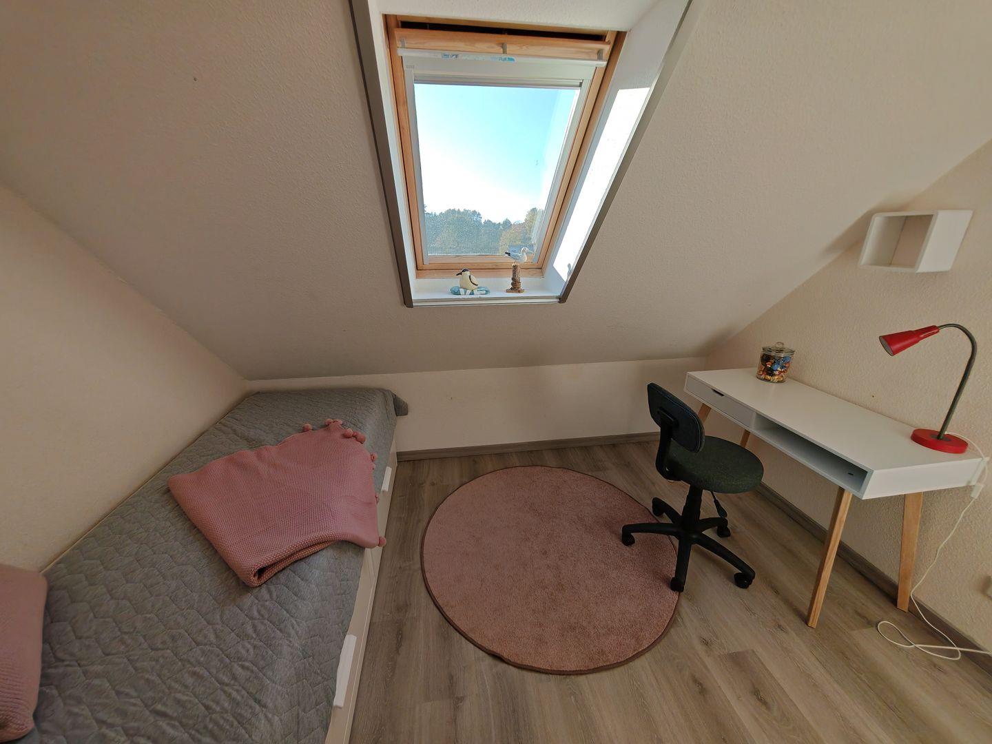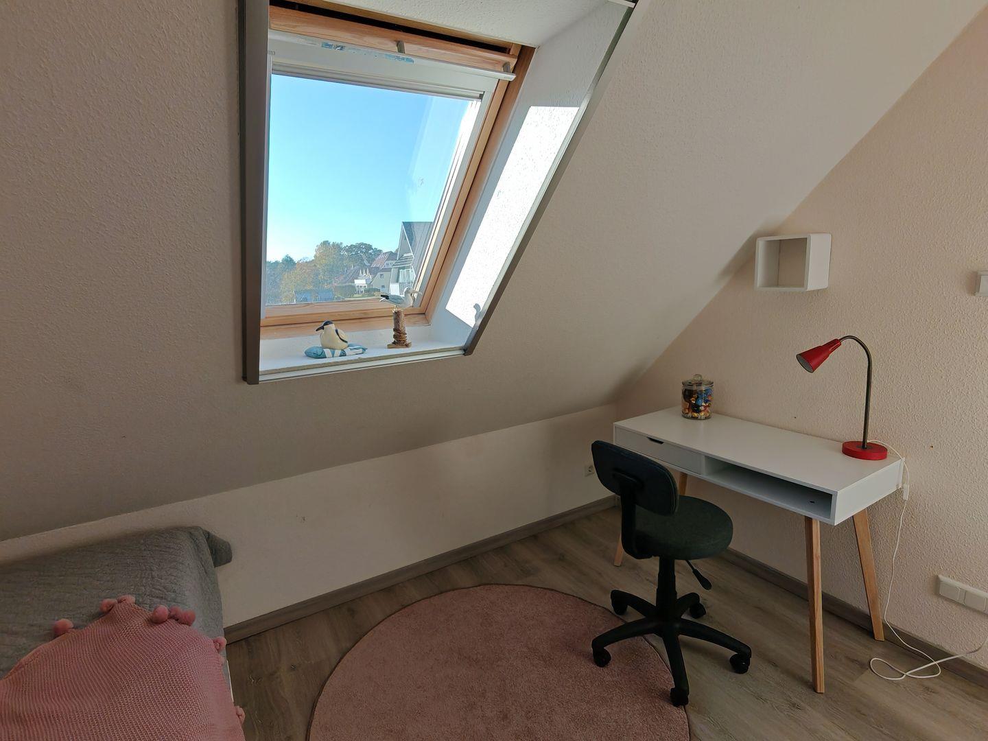Für besondere Anlässe oder berufliche Notwendigkeiten steht ein Schreibtisch mit Stuhl bereit, um in einer inspirierenden Umgebung produktiv zu arbeiten.