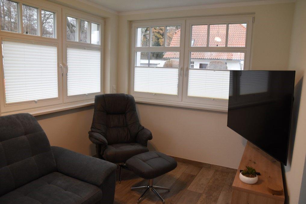 Fenster mit Insektenschutzgittern, Plissee und elektrischen Rollläden ausgestattet