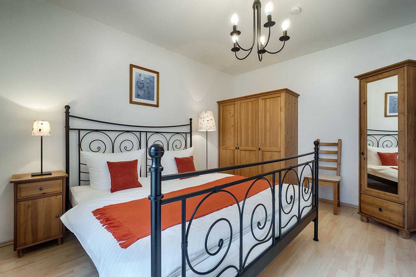 Das Schlafzimmer ist mit einem Doppelbett (180 x 200 cm; durchgehende Matratze) ausgestattet und auf Wunsch können ein Reisebett (ohne Bettzeug) sowie ein Hochstuhl bereitgestellt werden.