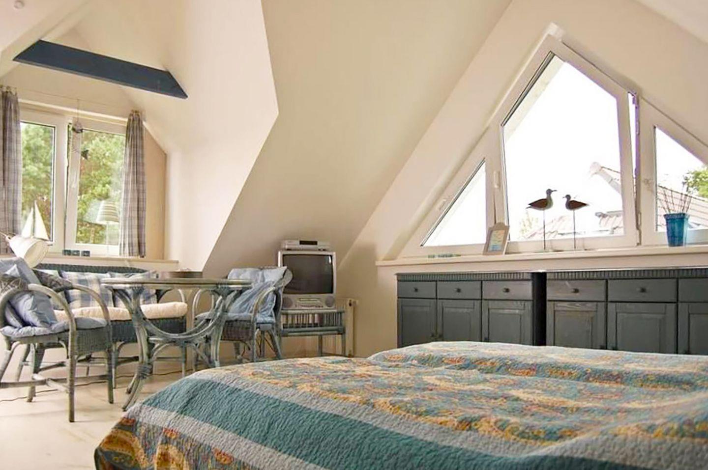 Im Dachgeschoss finden Sie ein weiteres Schlafzimmer mit einem größeren Doppelbett (180 x 200 cm), Radio und Sat-TV. Für das Kleinkind stehen ein Reisebett (ohne Bettzeug) und ein Hochstuhl zur Verfügung. Zu den weiteren Annehmlichkeiten gehören Fliegenschutzgitter, ein Fahrradschuppen und ein PKW-Stellplatz.