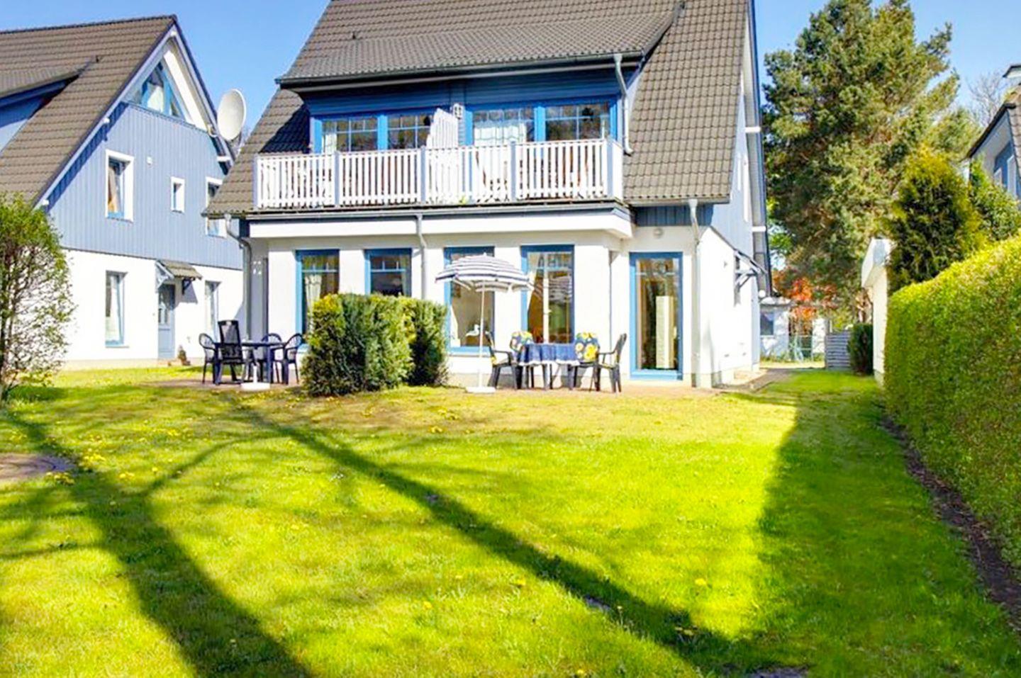 Ferienwohnung im Ortskern von Prerow, bis 4 Personen + Kleinkind (bis 3 Jahre) | ca. 57 m² Wohnfläche | OG und DG | Im OG Wohnbereich mit Sofa und kleinem Flachbild-Sat-TV, Essbereich für vier Personen, offene Küche (Kühlschrank m. Gefrierfach, Cerankochfeld, Backofen, Geschirrspüler, Kaffeemaschine, Toaster, Wasserkocher, Mikrowelle), Duschbad mit WC und Waschbecken, 1 Schlafzimmer mit Doppelbett (160 x 200 cm), im DG 1 Schlafzimmer mit Doppelbett (180 x 200 cm), Radio und Sat-TV, Reisebett (ohne Bettzeug) und Hochstuhl vorhanden, Fliegenschutzgitter, Fahrradschuppen, ein PKW-Stellplatz, möblierter Südbalkon, separates Saunahaus (6 x 2 € für 2 Stunden) im Garten zur gemeinschaftlichen Nutzung, Bettwäsche kann für 12 € und Handtücher für 8 € pro Person gemietet werden, Nichtraucherhaus, Haustiere sind nicht gestattet, kostenfreier