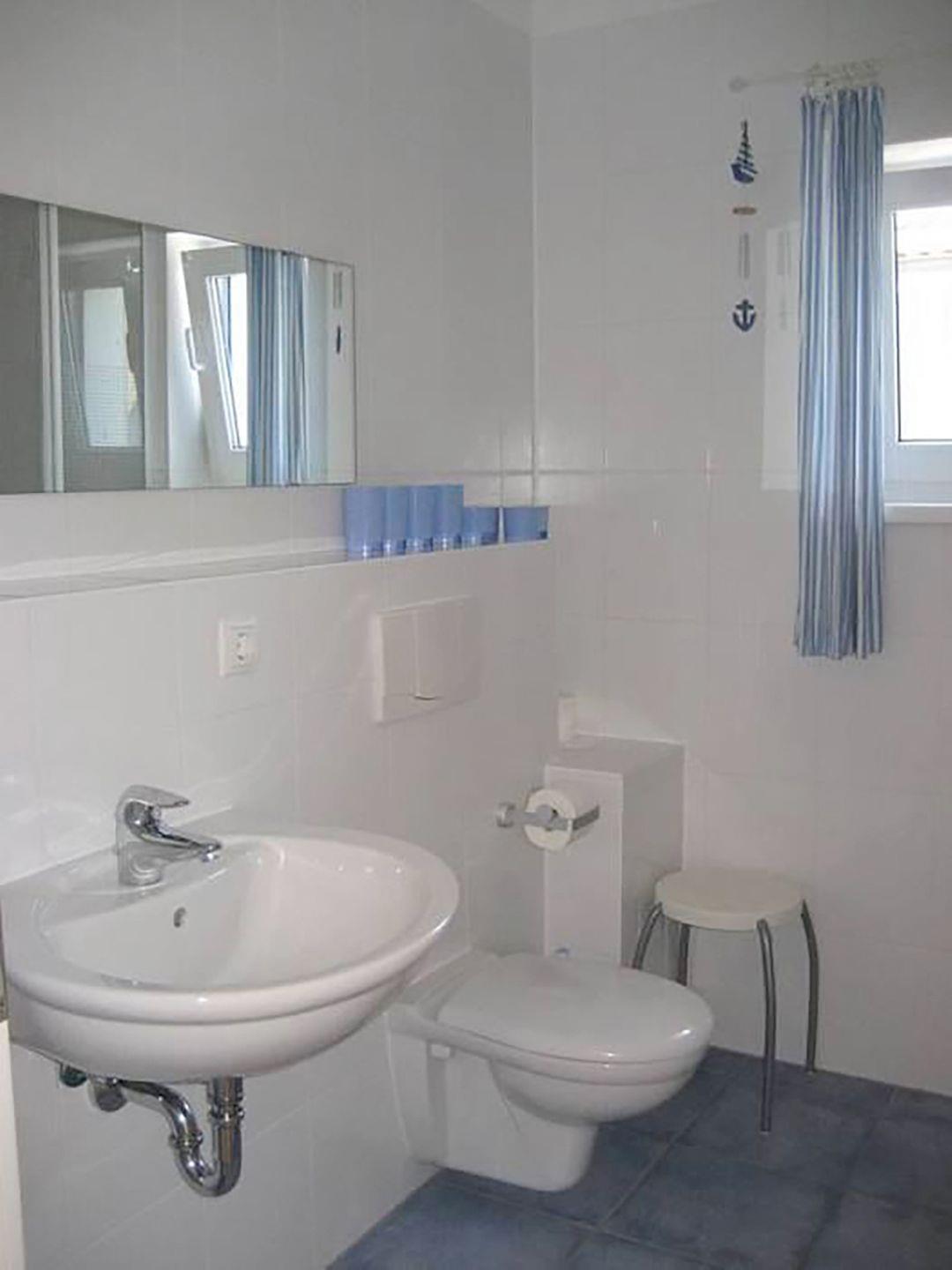 Die offene Küche ist voll ausgestattet mit einem Kühlschrank inkl. Gefrierfach, Cerankochfeld, Backofen, Geschirrspüler, Kaffeemaschine, Toaster, Wasserkocher und Mikrowelle. Ein Duschbad mit WC und Waschbecken rundet die Ausstattung ab. Das erste Schlafzimmer im OG ist mit einem Doppelbett (160 x 200 cm) eingerichtet.