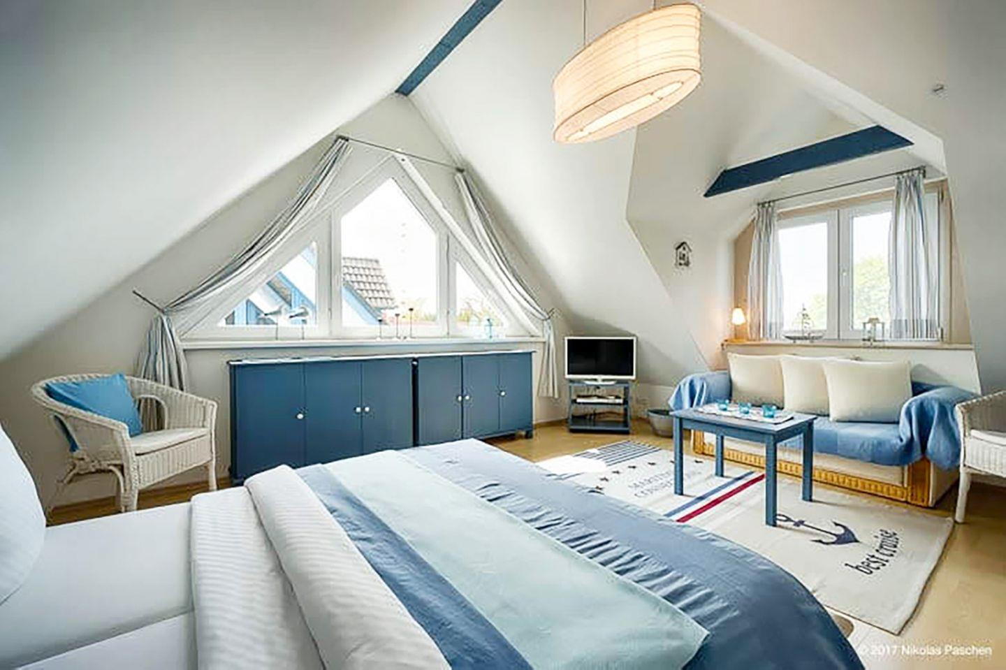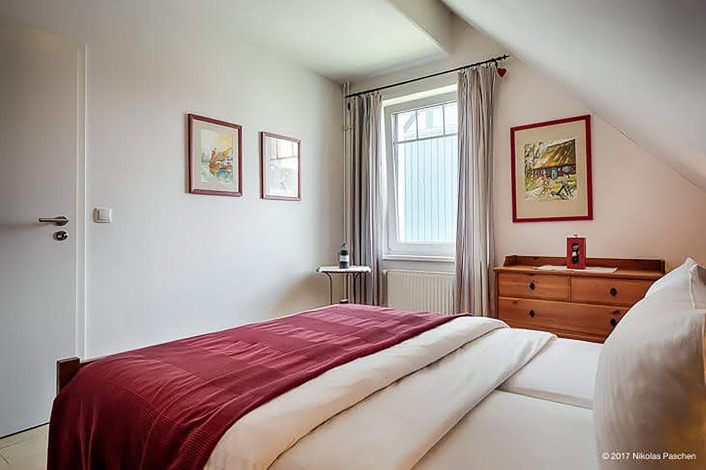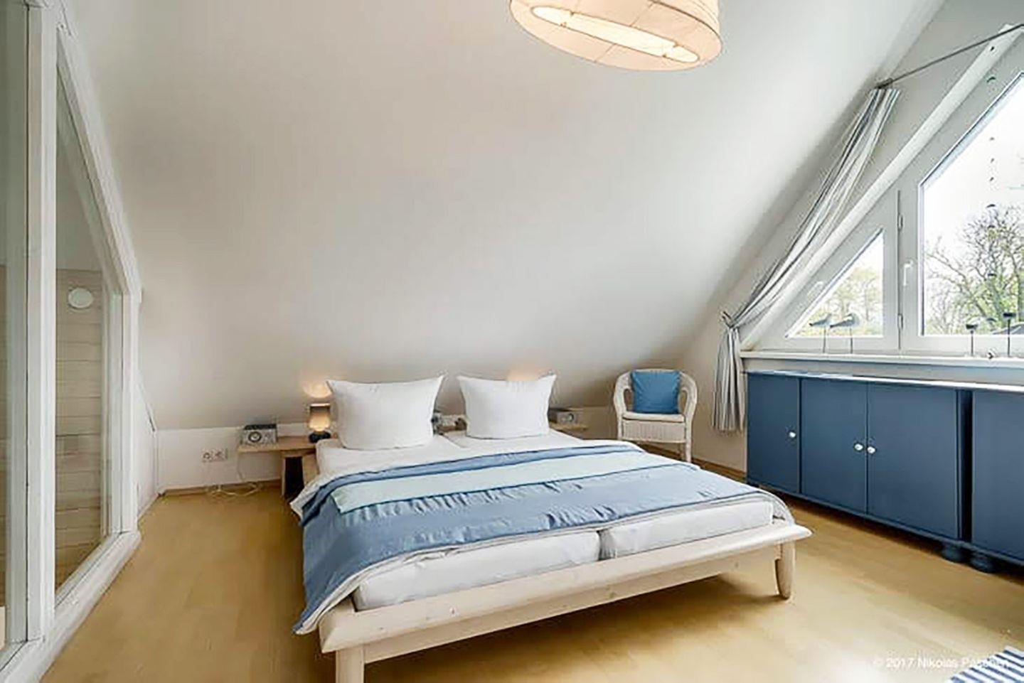 Ein Duschbad mit WC und Waschbecken vervollständigt das OG. Das erste Schlafzimmer im OG ist mit einem Doppelbett (180 x 200 cm) ausgestattet. Im Dachgeschoss befindet sich das zweite Schlafzimmer, ebenfalls mit einem Doppelbett (180 x 200 cm), Radio und Sat-TV.