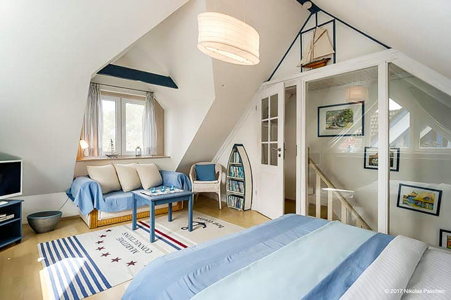 Diese charmante Ferienwohnung im Ortskern von Prerow bietet auf ca. 57 m² Wohnfläche Platz für bis zu 4 Personen und ein Kleinkind (bis 3 Jahre). Die Wohnung erstreckt sich über das Obergeschoss (OG) und Dachgeschoss (DG) und ist ideal für Familien oder Paare.