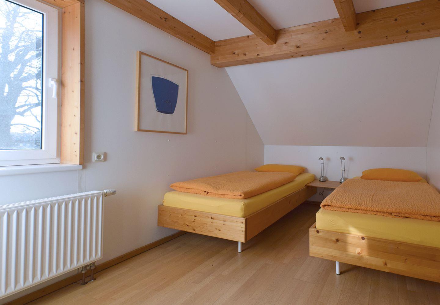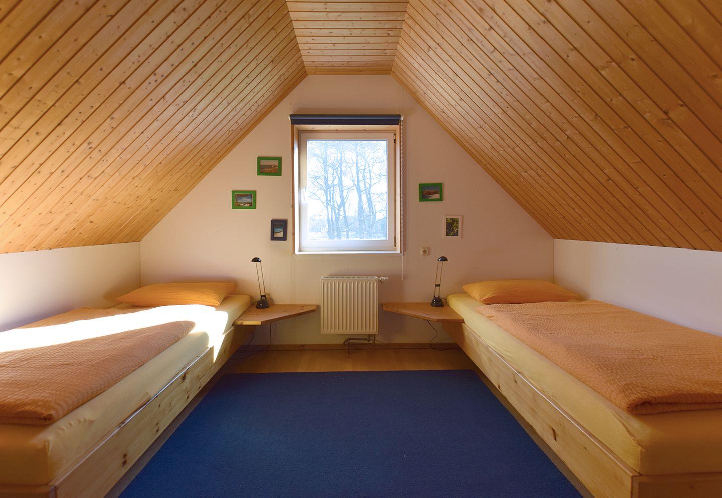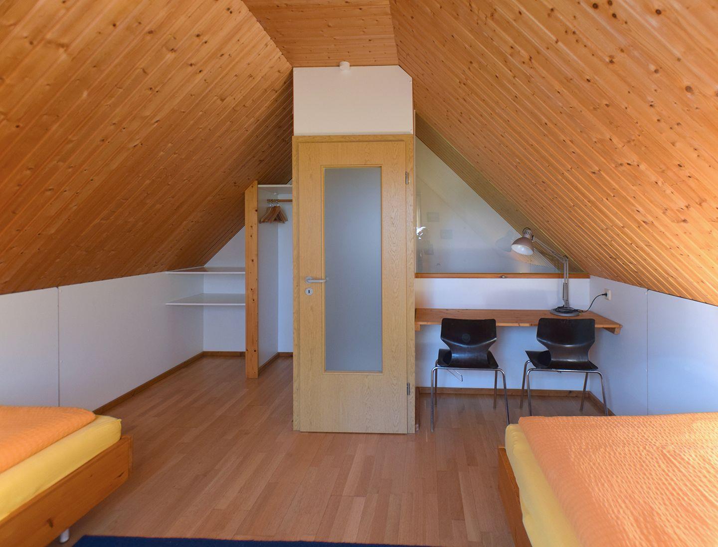 Das Dachgeschoss bietet ein weiteres Schlafzimmer mit zwei Einzelbetten (90 x 200 cm). Ein Reisebett ist ebenfalls vorhanden, ideal für die Kleinsten. Zur weiteren Ausstattung gehören ein Kinderhochstuhl sowie die gemeinschaftliche Nutzung von Garten und Spielplatz, Waschmaschine und Trockner. Für Ihren Aufenthalt stehen ein Parkplatz sowie WLAN zur Verfügung, damit Sie immer bestens verbunden sind.