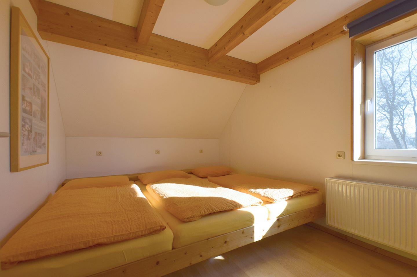 Das Obergeschoss ist mit zwei Schlafzimmern ausgestattet, die über eine Treppe mit Kindersicherung erreichbar sind. Ein Schlafzimmer verfügt über ein Familienbett (270 x 200 cm) und das zweite über zwei Einzelbetten (90 x 200 cm).