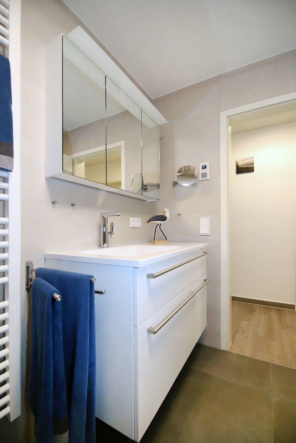 Das Badezimmer verfügt über eine bodengleiche Dusche mit Wandsitz, ein Dusch-WC, einen Kosmetikspiegel und eine Waschmaschine – ideal für längere Aufenthalte. Zusätzlich gibt es ein Gäste-WC.