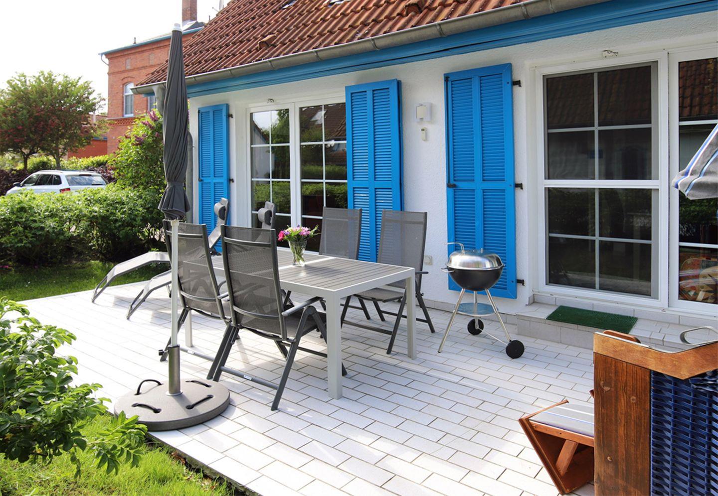 Genießen Sie Ihre Freizeit auf der Süd-Terrasse mit Gartenmöbeln und einem Strandkorb. Ein Kugelgrill lädt zu geselligen Grillabenden ein. Weitere Annehmlichkeiten wie eine Fahrradbox, WLAN und ein Parkplatz unmittelbar vor dem Haus runden das Angebot ab.