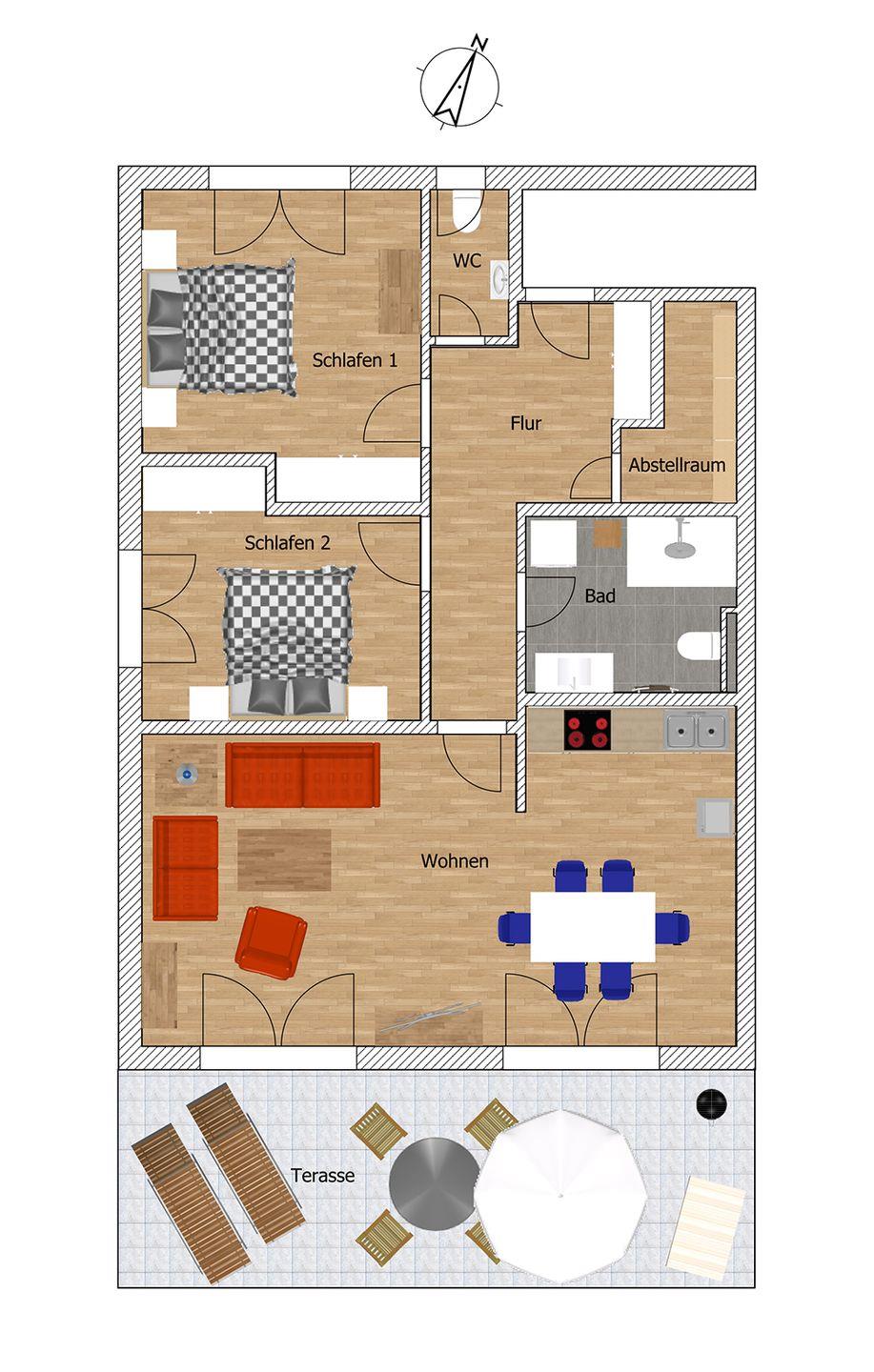 Ferienwohnung bis 4 Personen | Ca. 84 m2 Wohnfläche | EG Wohnbereich mit Küchenzeile, Bad, Gäste-WC, 2 Schlafzimmer | Süd-Terrasse | 1 Parkplatz | Wohnbereich Esstisch, Schlafsofa, Sitzgarnitur, Radio mit CD-Player, SAT-TV | Küchenzeile Backofen, Herd, Geschirrspüler, Kühlschrank mit Gefrierfach, Kaffeemaschine, Toaster, Wasserkocher, Mikrowelle | Bad bodengleiche Dusche mit Wandsitz, Dusch-WC, Kosmetikspiegel, Waschmaschine, Radio | Gäste-WC | 2 Schlafzimmer je 1 Boxspringbett (180 x 200 cm) | Kinderhochstuhl, Reisebett, Gartenmöbel, Strandkorb, Fahrradbox, Kugelgrill, WLAN