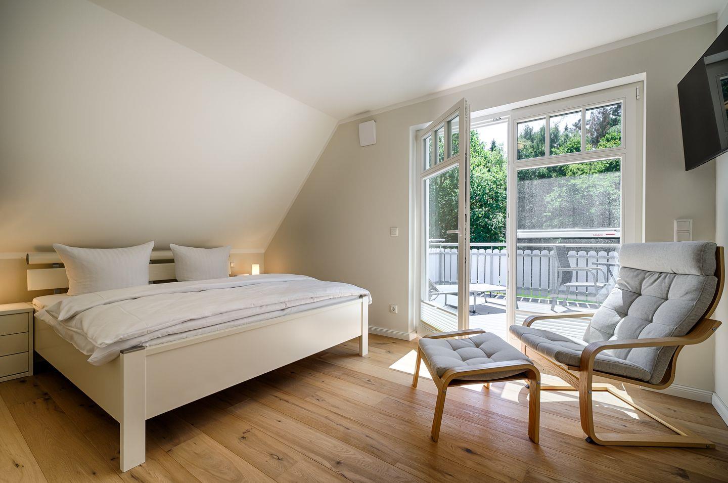 1 Schlafzimmer mit Doppelbett (1,80 x 2,00 m) und Zugang zur Dachterrasse, TV, 1 Sessel, raumanliegend eigenes Badezimmer mit DU/WC