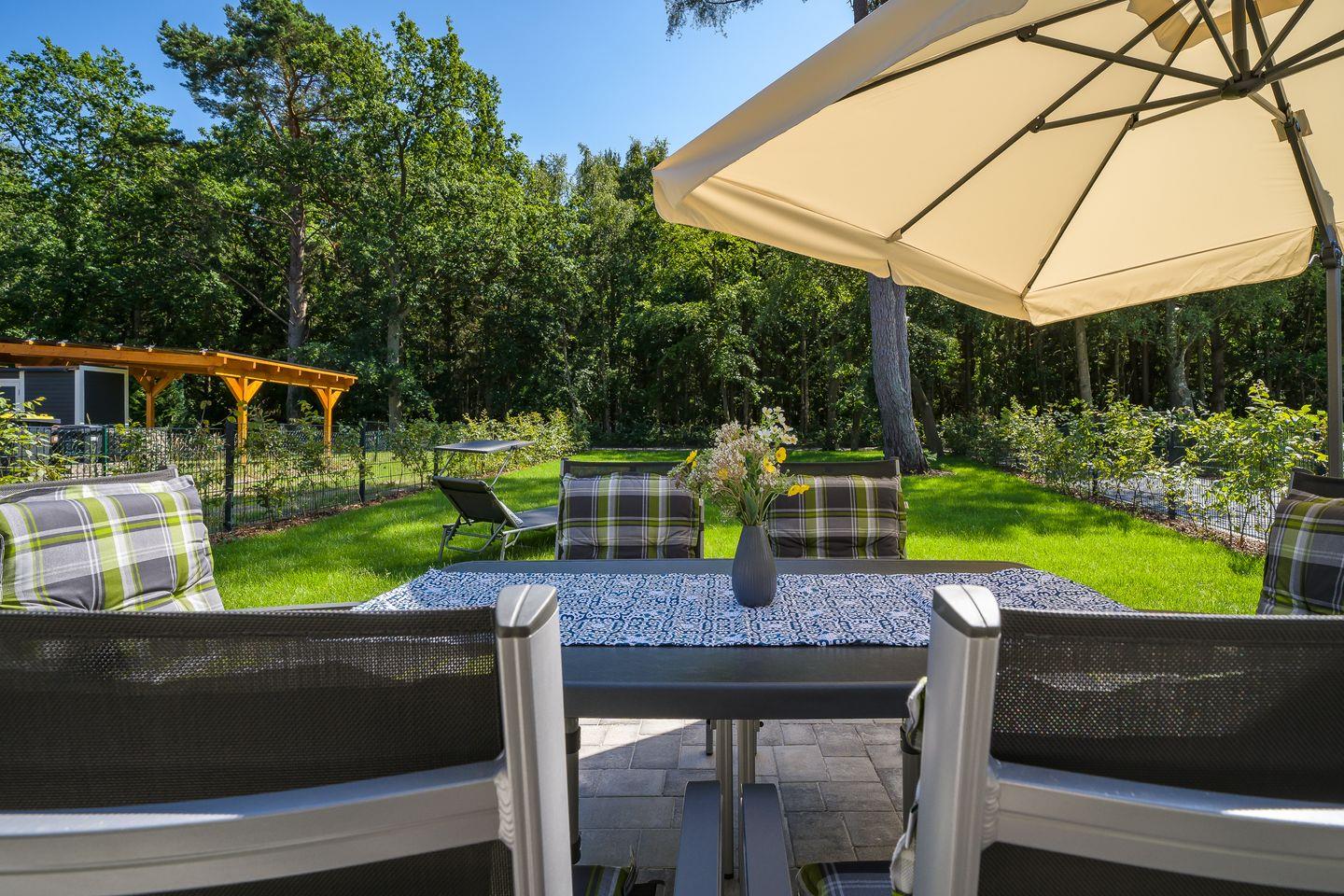 Darßveranda mit großzügigem Esstisch und Waldblick