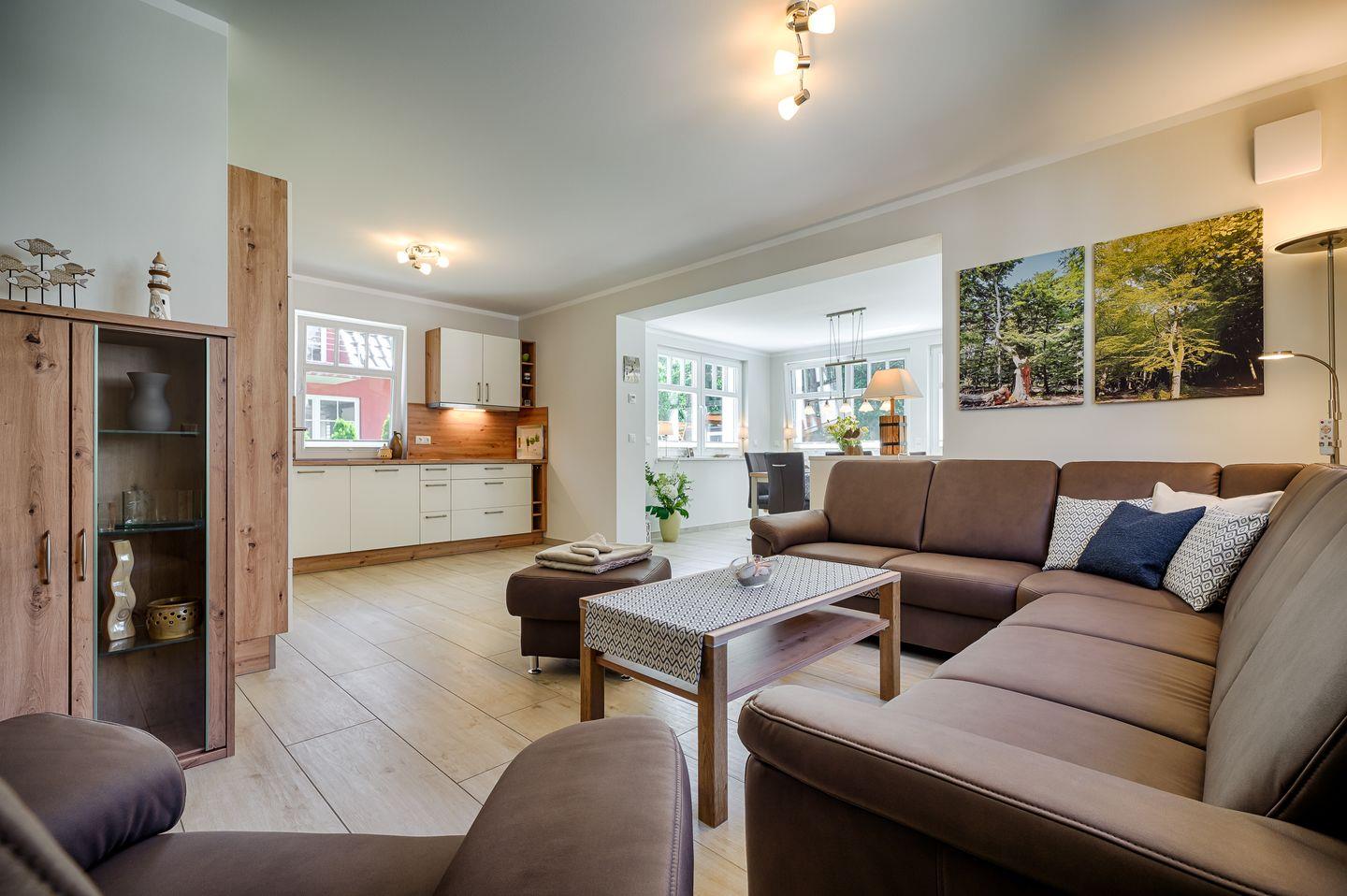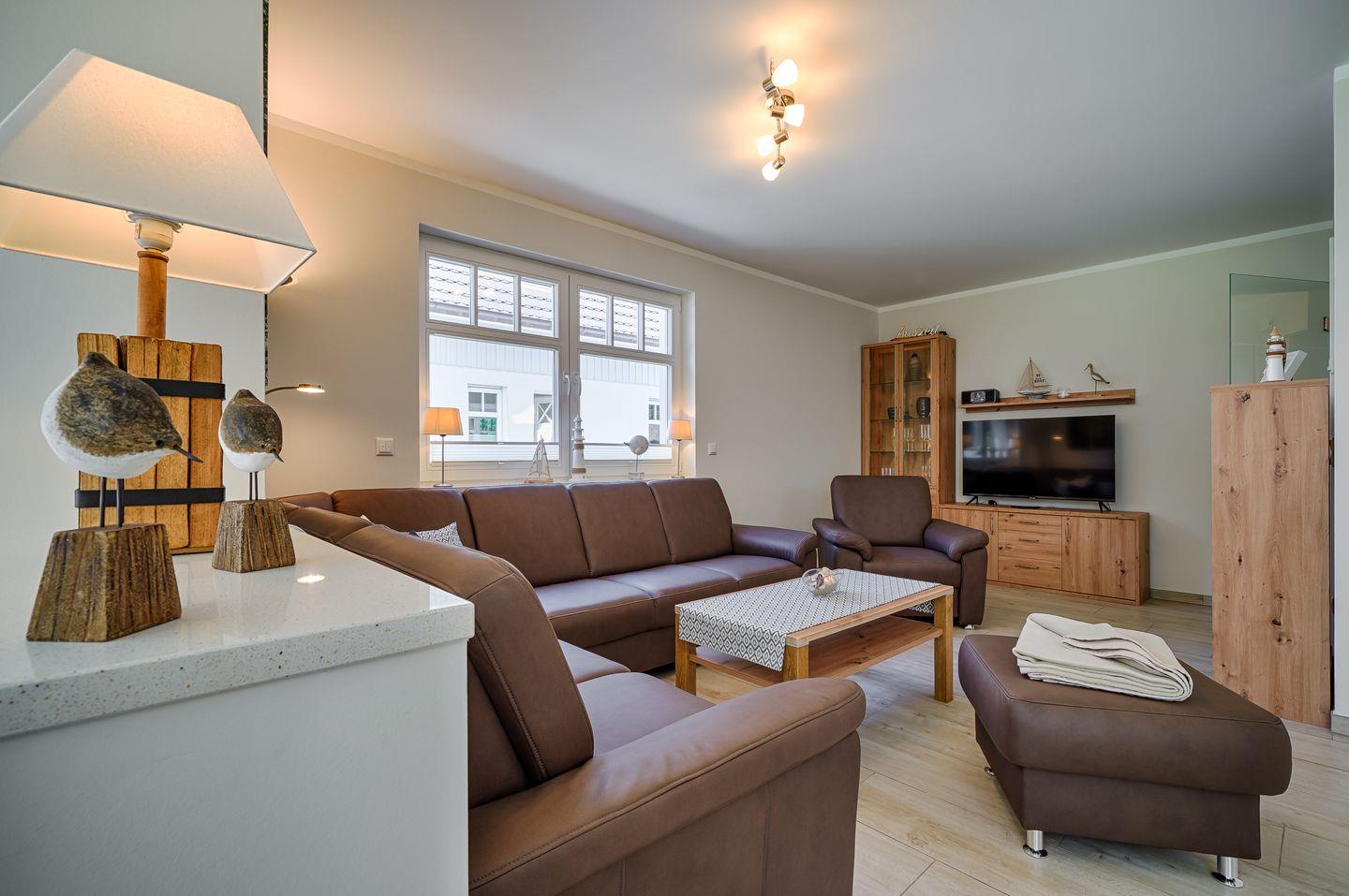 Wohnbereich mit Couchgarnitur, Vitrine, TV, Internetradio