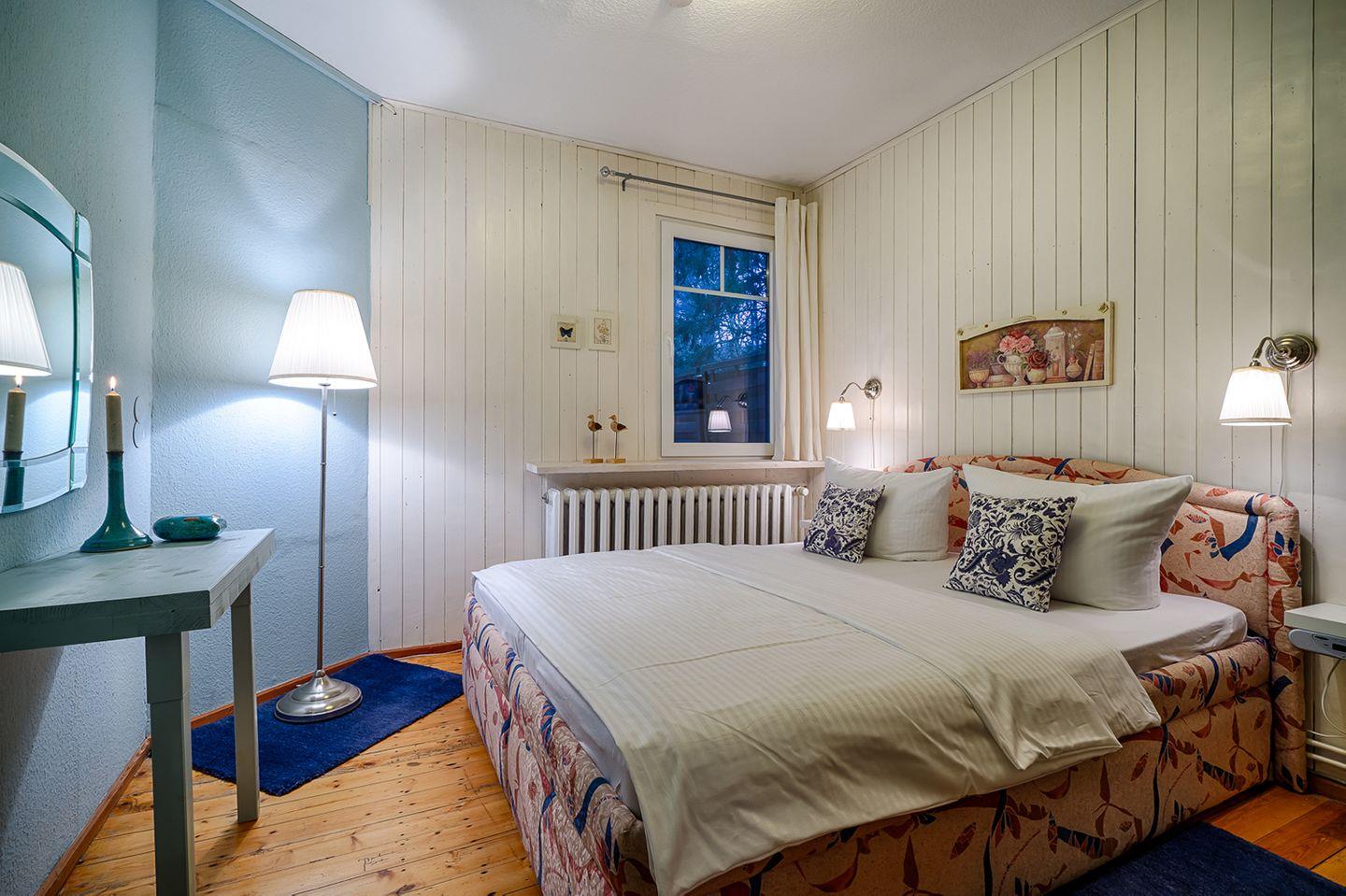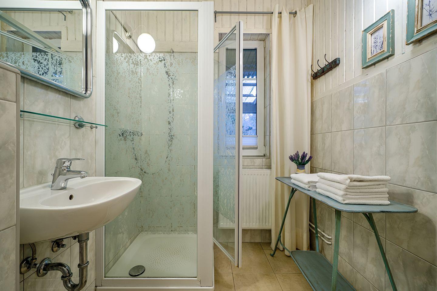 Die moderne, separate Küche ist komplett ausgestattet mit einem Backofen, Geschirrspüler, E-Herd (Cerankochfelder), Kaffeemaschine, Kühlschrank mit Gefrierfach, Mikrowelle, Toaster und Wasserkocher – hier können Sie Ihre Lieblingsgerichte zubereiten. Das Badezimmer verfügt über eine Dusche und ein WC, während das Schlafzimmer mit einem komfortablen Doppelbett (160 x 200 cm) und einem Kleiderschrank ausgestattet ist.