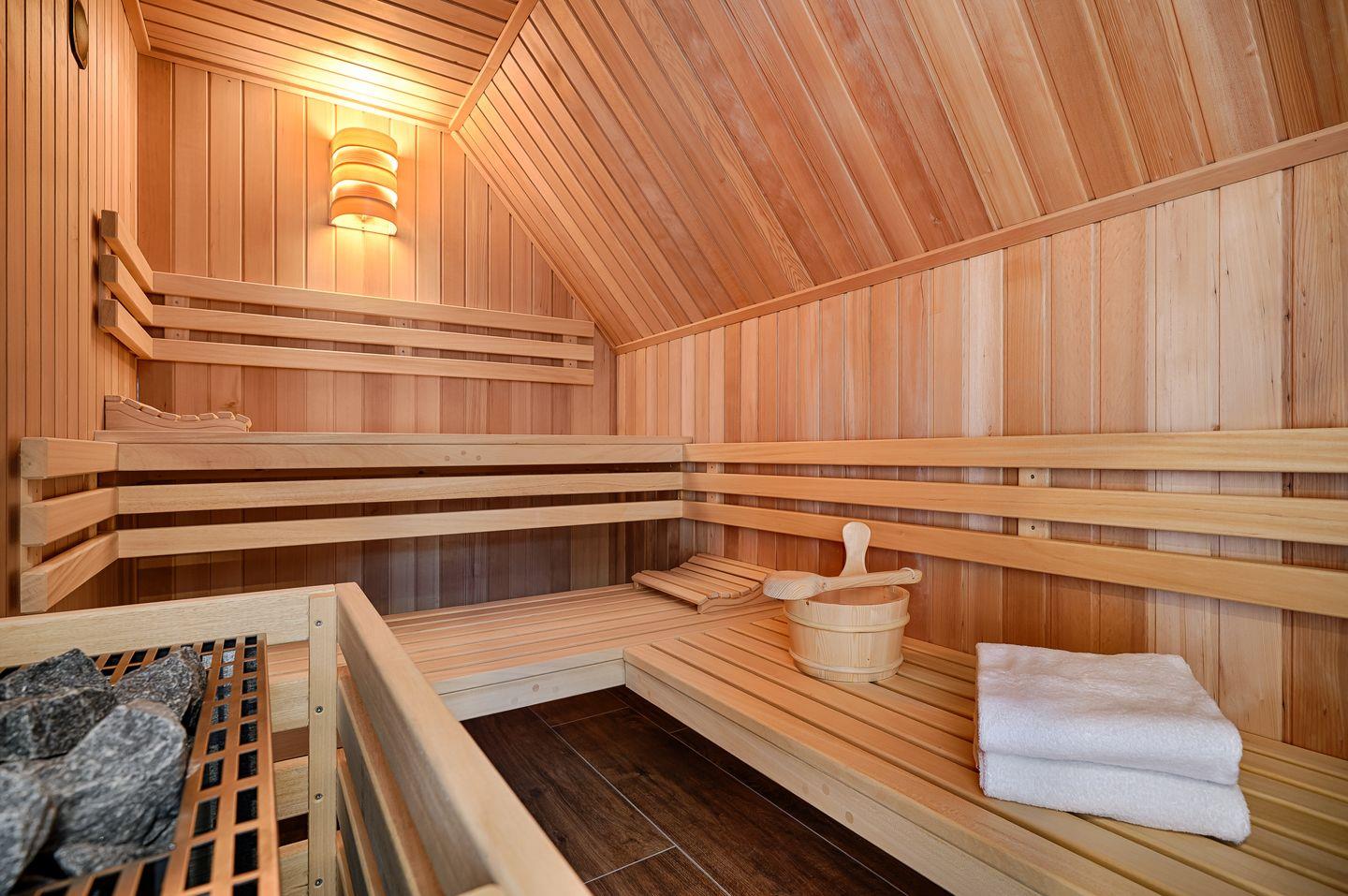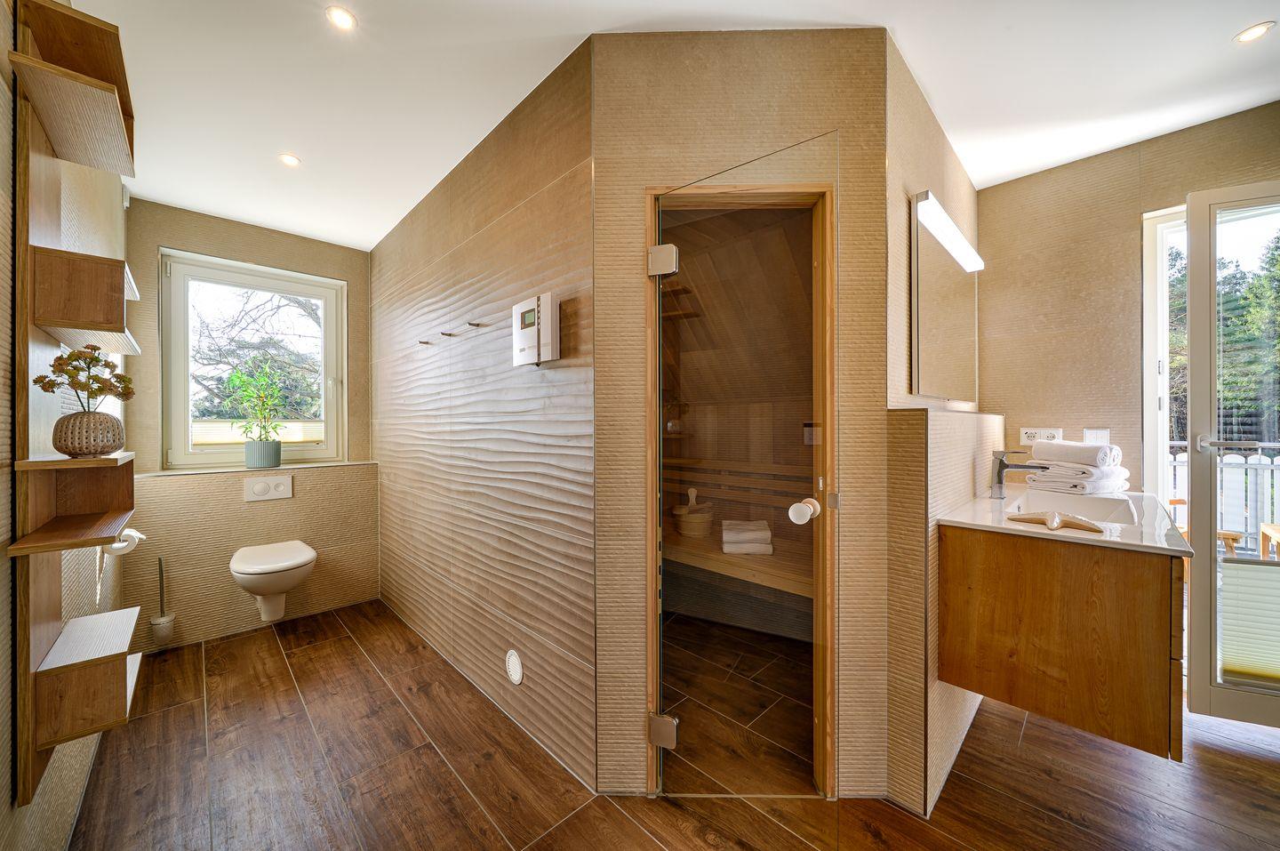 Tageslichtbad mit ebenerdiger Du/WC und anliegender Sauna (kostenfrei), Zugang zur Dachterrasse