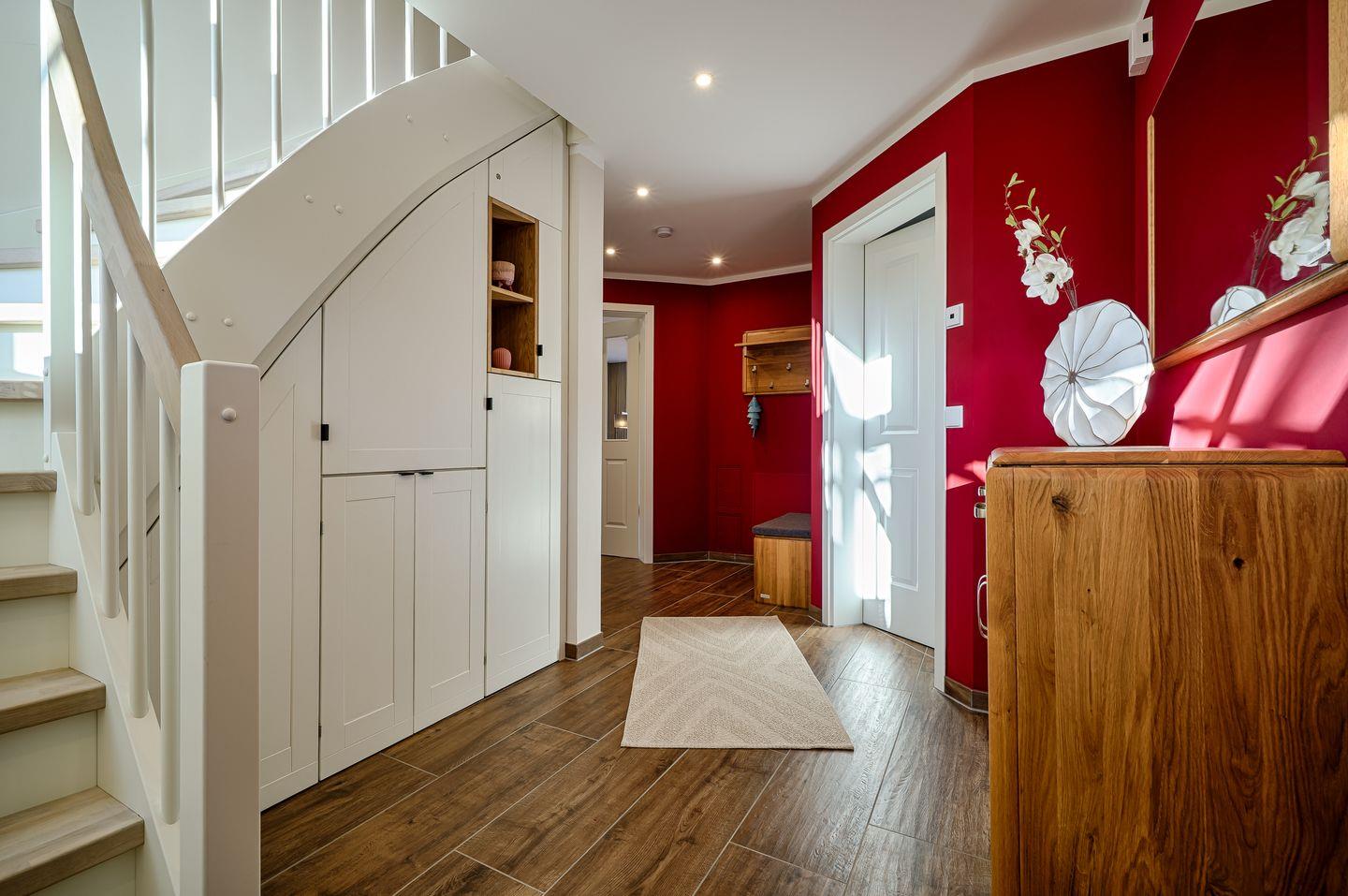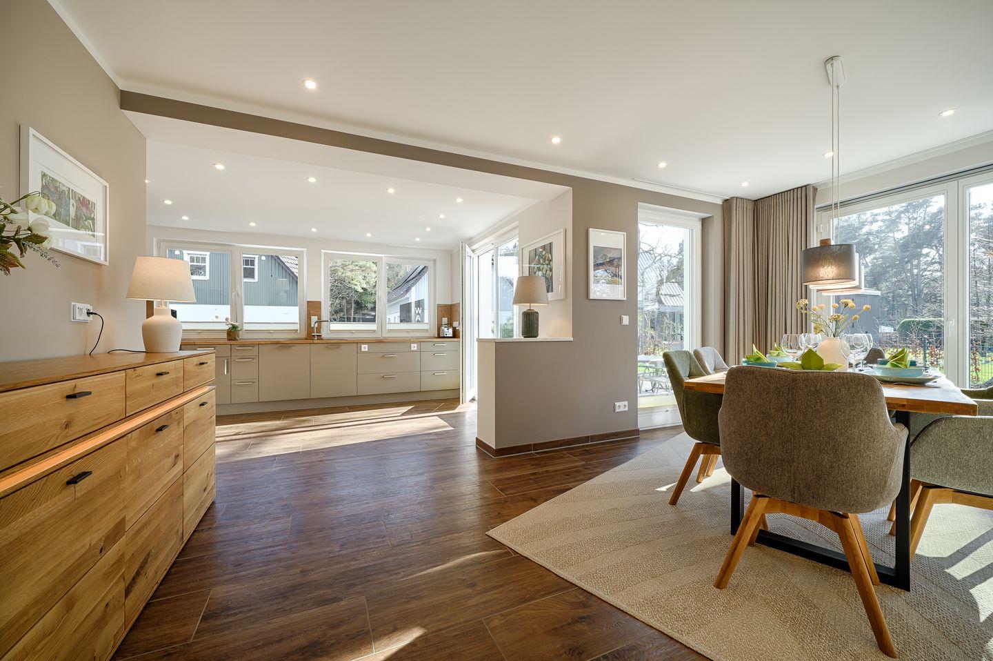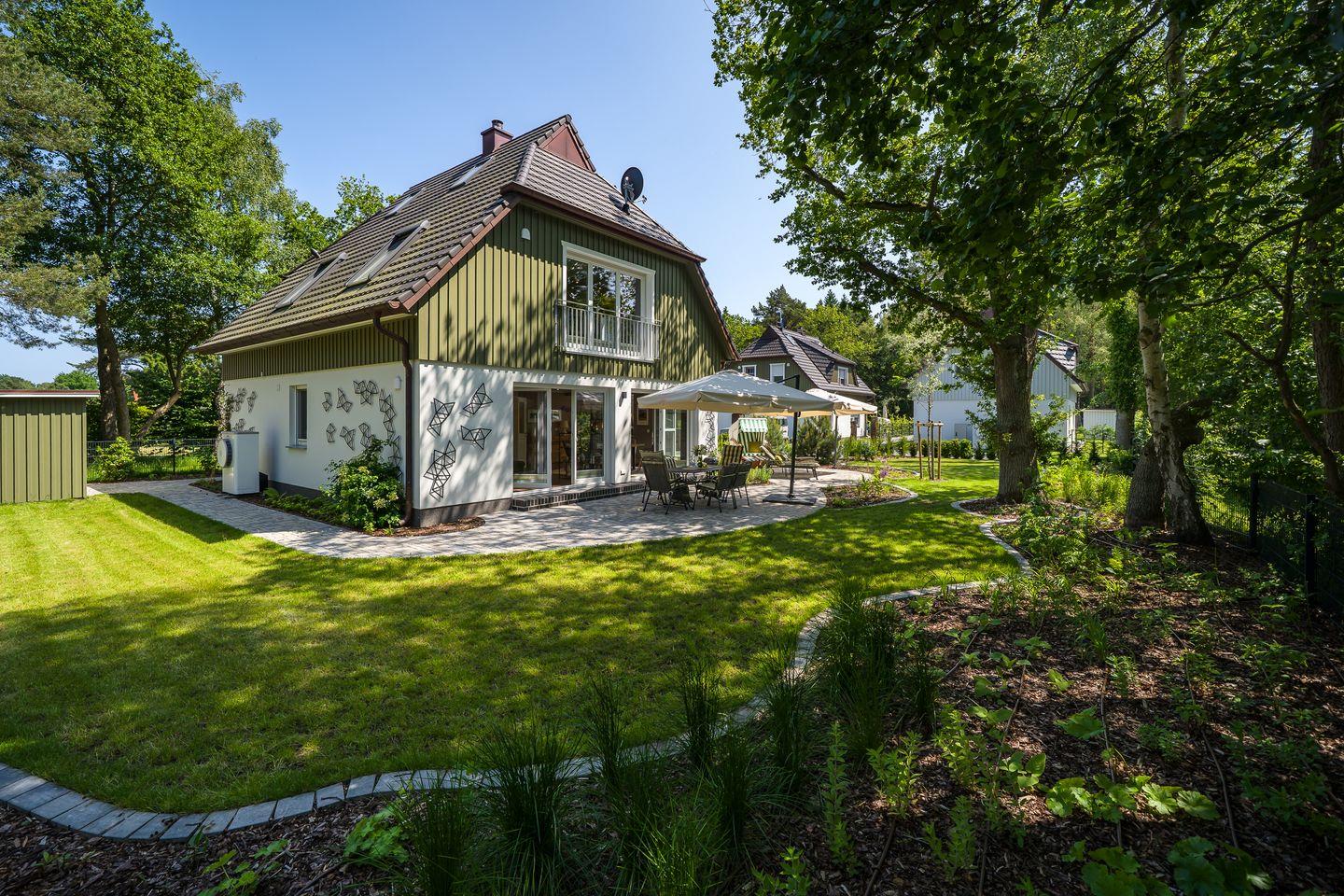 bodentiefe Fensterfront im EG und OG mit Blick in den Garten