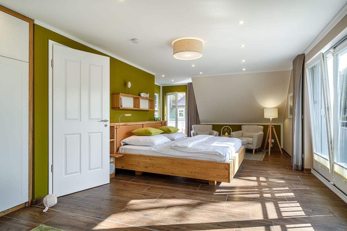 1 großzügiges Schlafzimmer mit Doppelbett (1,80 x 2,00 m) und Zugang zur Dachterrasse, TV, Sitzecke