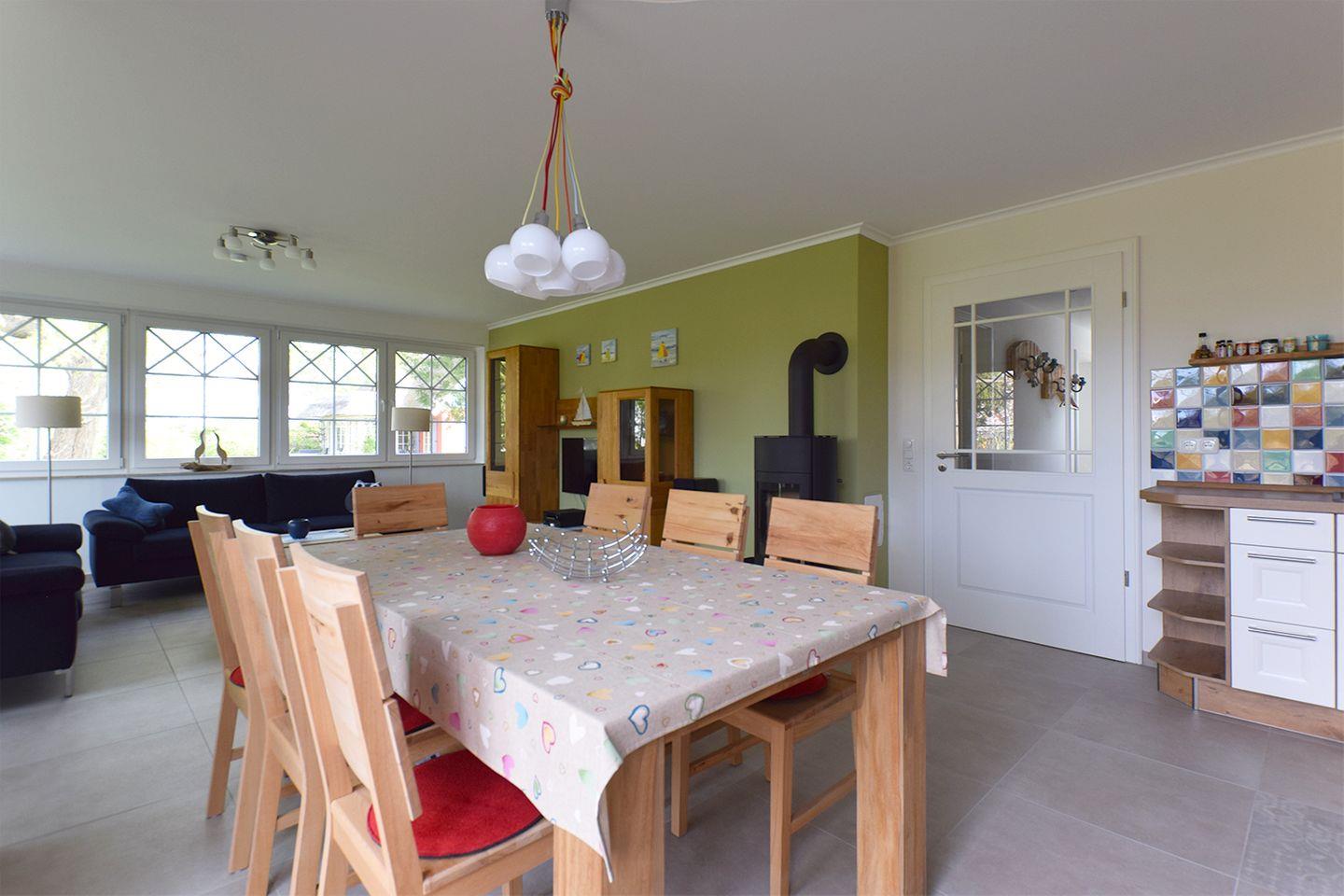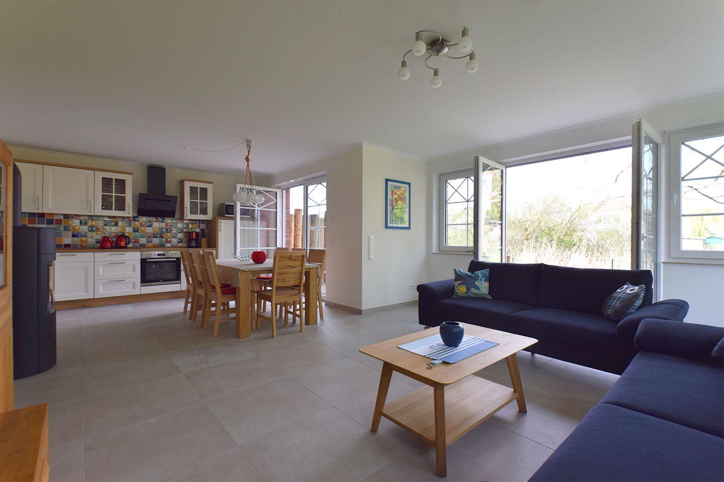 Das im Jahr 2025 fertig gestellte Haus bietet auf 110 m² Wohnfläche ausreichend Platz für bis zu sieben Personen und ist damit ideal für Familien oder Gruppen, die gemeinsam einen komfortablen Urlaub verbringen möchten. Die Unterkunft erstreckt sich über zwei Etagen, wobei sich die Hauptebene auf dem Parterre befindet. Insgesamt verfügt das Haus über fünf Zimmer, darunter vier Schlafzimmer mit Laminatboden. Das Wohnzimmer hingegen ist mit Fliesenboden ausgestattet und lädt durch eine gemütliche Sofaecke sowie einen Kaminofen zu entspannten Stunden ein. Durch die Fußbodenheizung im gesamten Haus ist für eine angenehme Wärme gesorgt.