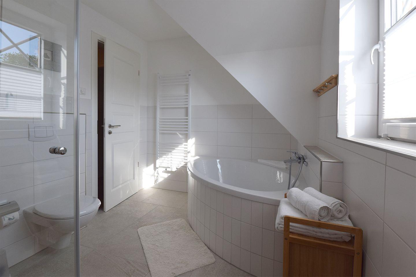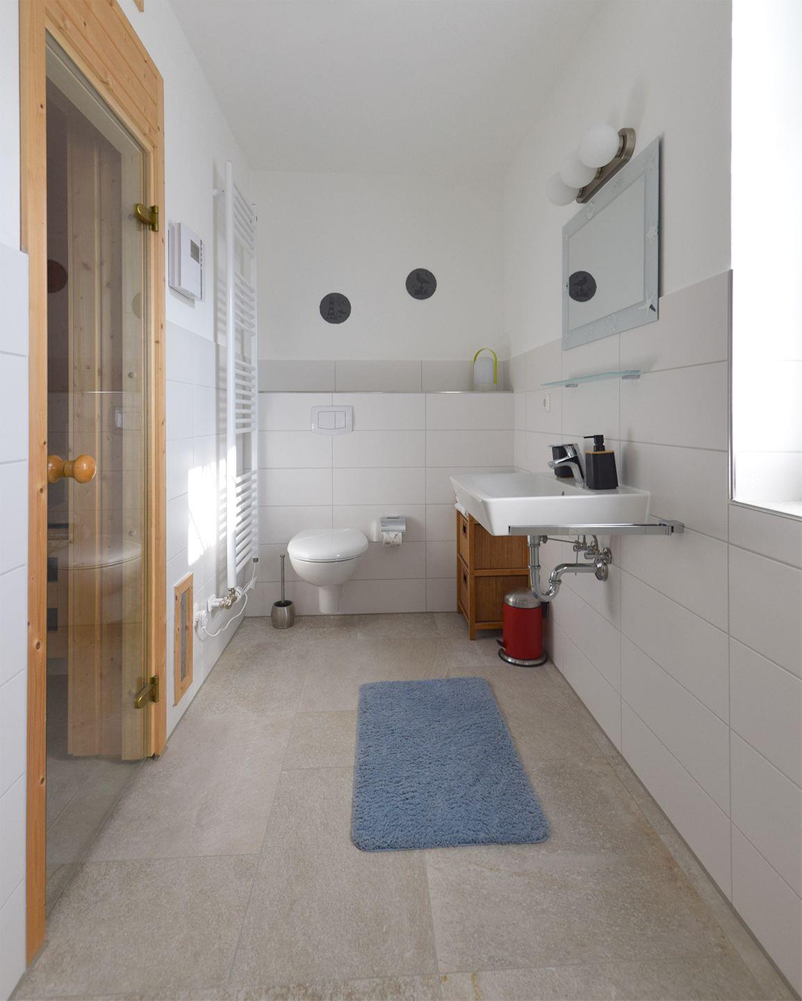 Das Haus verfügt über zwei Badezimmer. Das Bad im EG ist mit einer bodengleichen Dusche, WC, Waschbecken, Spiegel und Haartrockner ausgestattet. Für Erholung und Wellness steht eine eigene Sauna zur Verfügung. Das zweite Bad im 1. OG bietet eine Eckbadewanne und eine bodengleiche Dusche. Beide Badezimmer verfügen über warmes Wasser und sorgen mit Fenstern für angenehme Belüftung. Für weiteren Komfort sorgen außerdem eine eigene Waschmaschine sowie ein Wäscheständer.