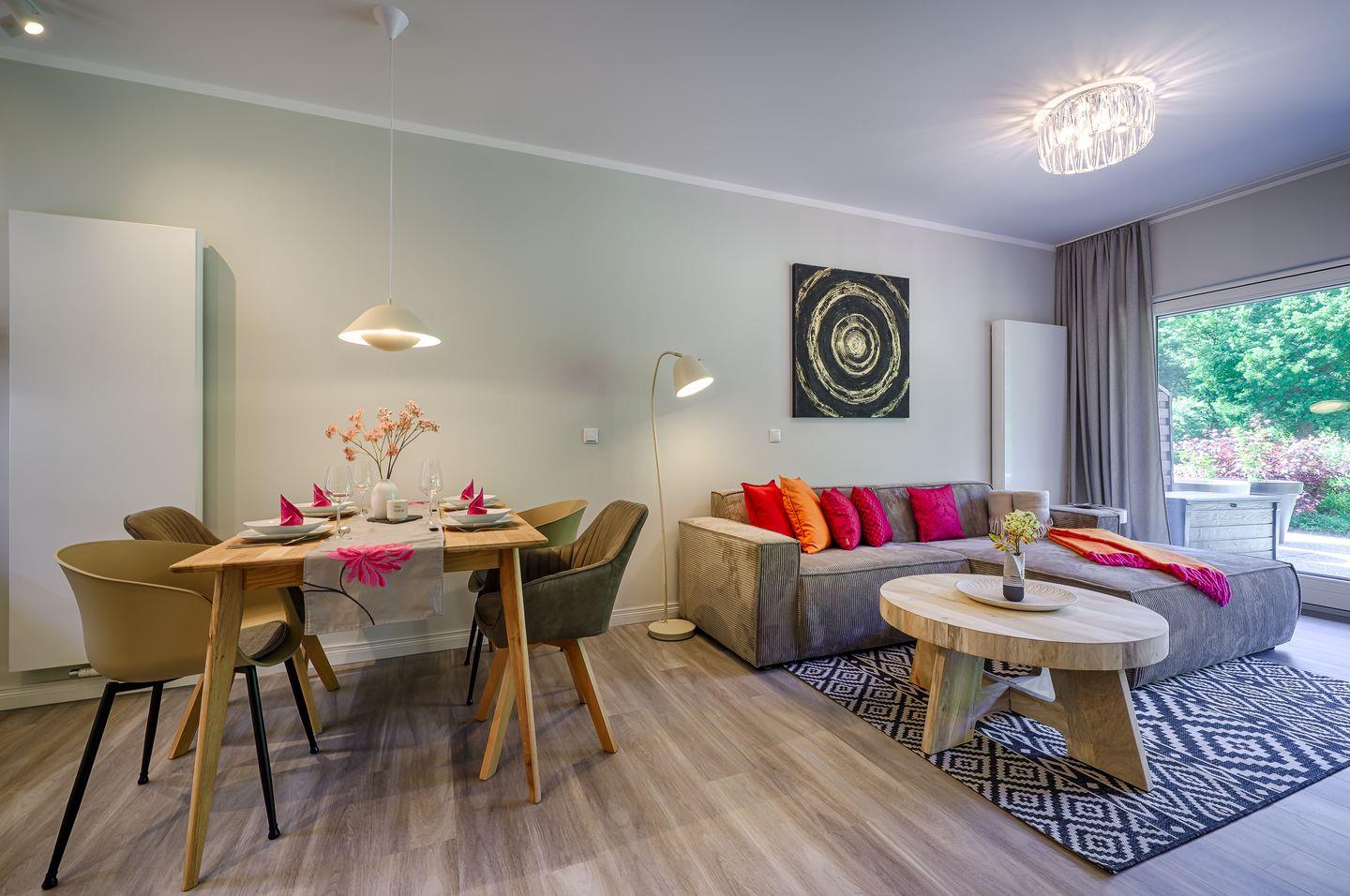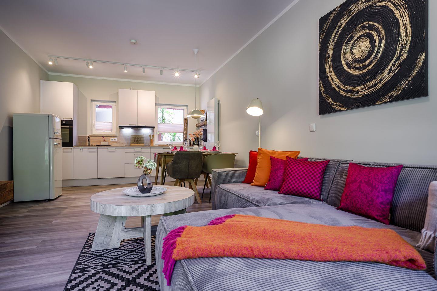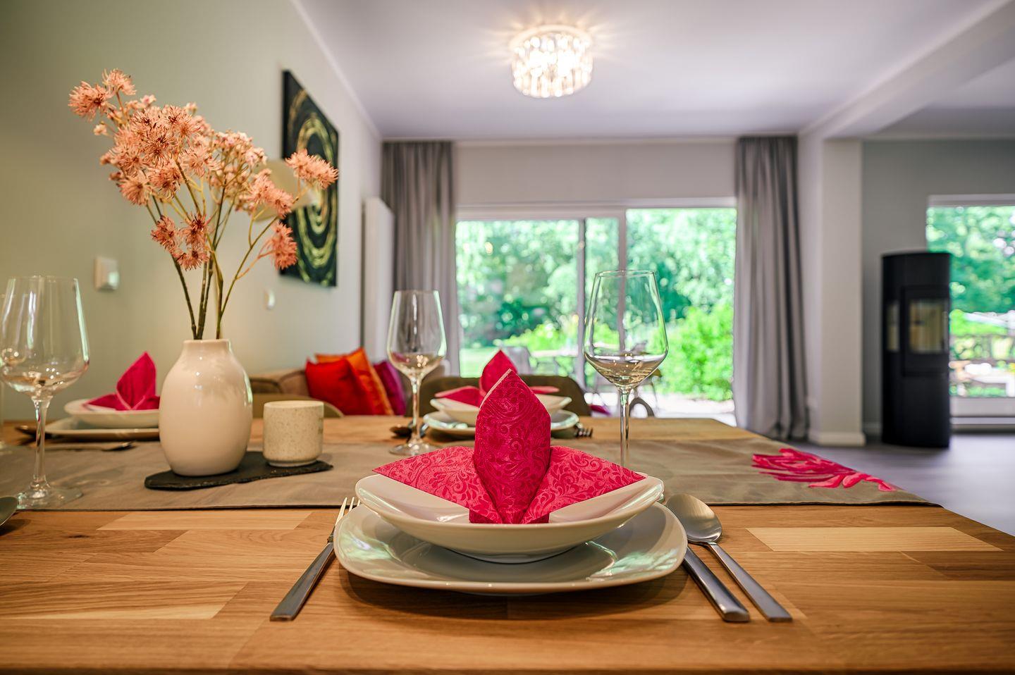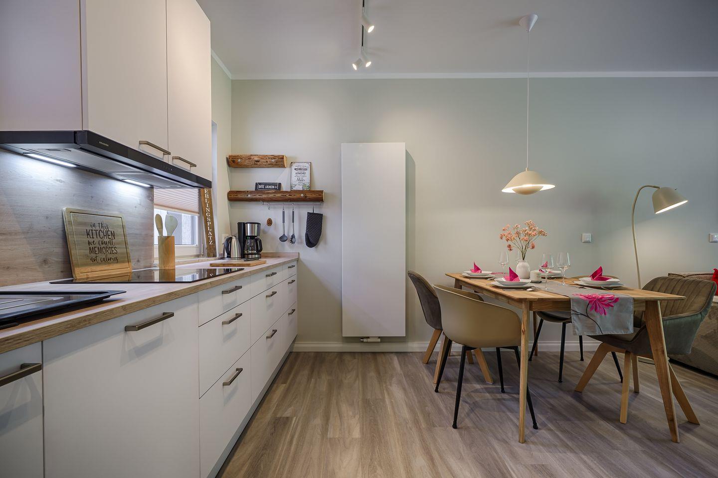 komplett eingerichtete Einbauküche mit Induktionsherd und Esstisch für 4 Personen