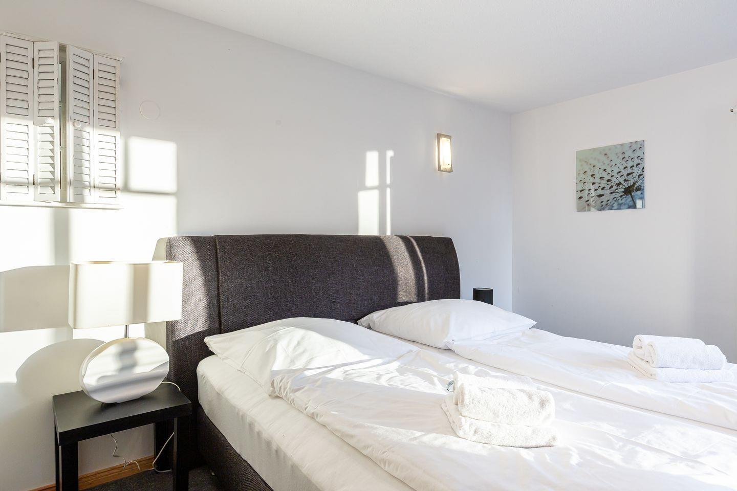 Beim Eintritt stehst du in der großen Veranda, die viel Licht hereinlässt und einen herrlichen Blick ins Grüne ermöglicht. Mit drei gemütlichen Schlafzimmern und zwei Bädern en suite ist ausreichend Platz für Familie und Gäste im Erdgeschoss vorhanden. Der Wohn- und Küchenbereich befindet sich im ersten Stock und lädt mit einem großen Esstisch, einer Sofaecke sowie einem TV zu entspannten Stunden ein. Die voll ausgestattete Küche macht das gemeinsame Kochen zum Vergnügen. Ein drittes Bad rundet den Wohnkomfort ab.