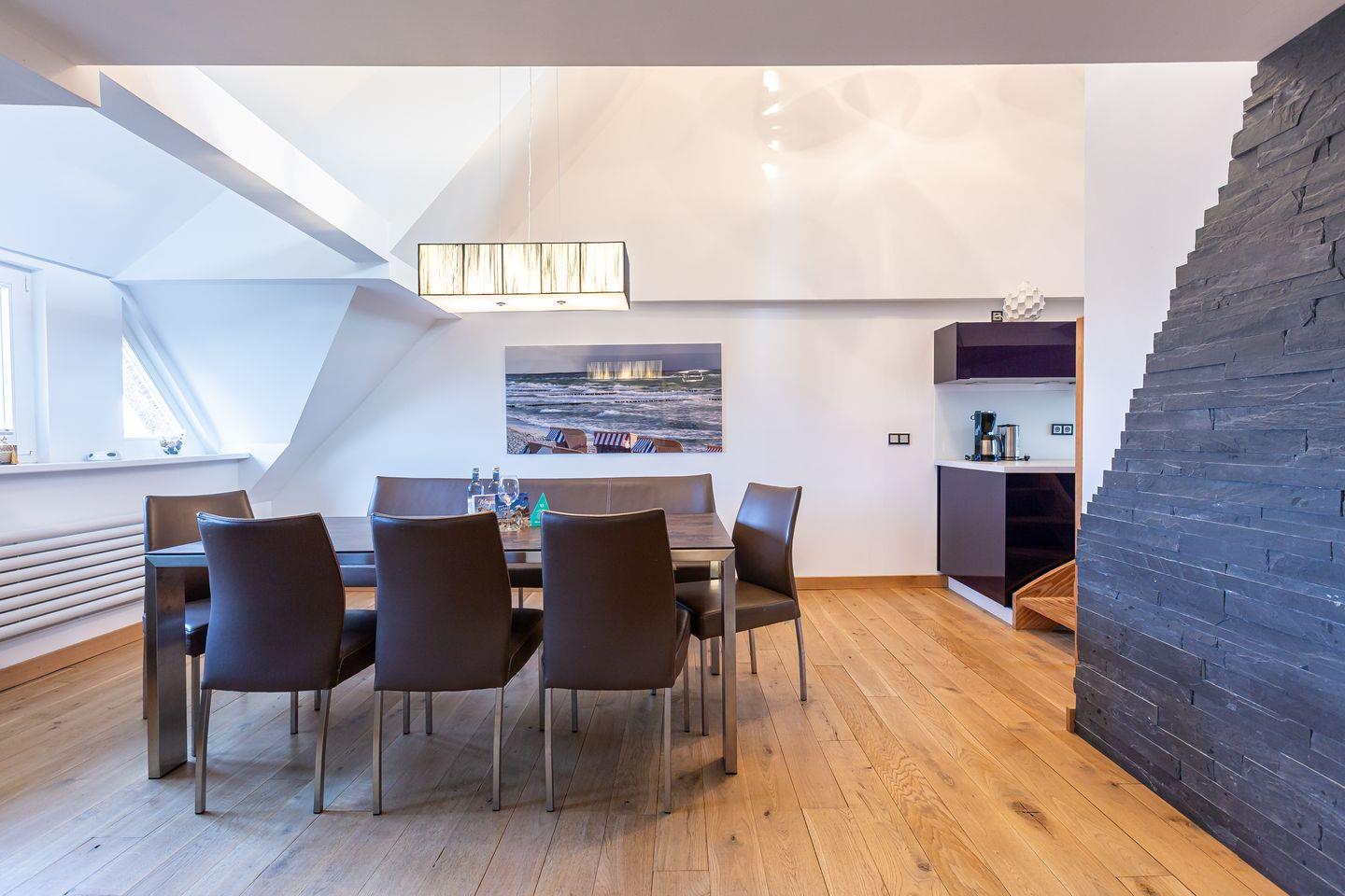 Noch eine Treppe höher erwartet dich ein Chillout-Bereich mit Sofa – der perfekte Ort, um die Ruhe zu genießen und den Ausblick auf die umliegende Natur schweifen zu lassen. Ein kleiner Balkon ergänzt das Angebot und schafft zusätzlichen Raum für entspannte Momente an der frischen Luft.