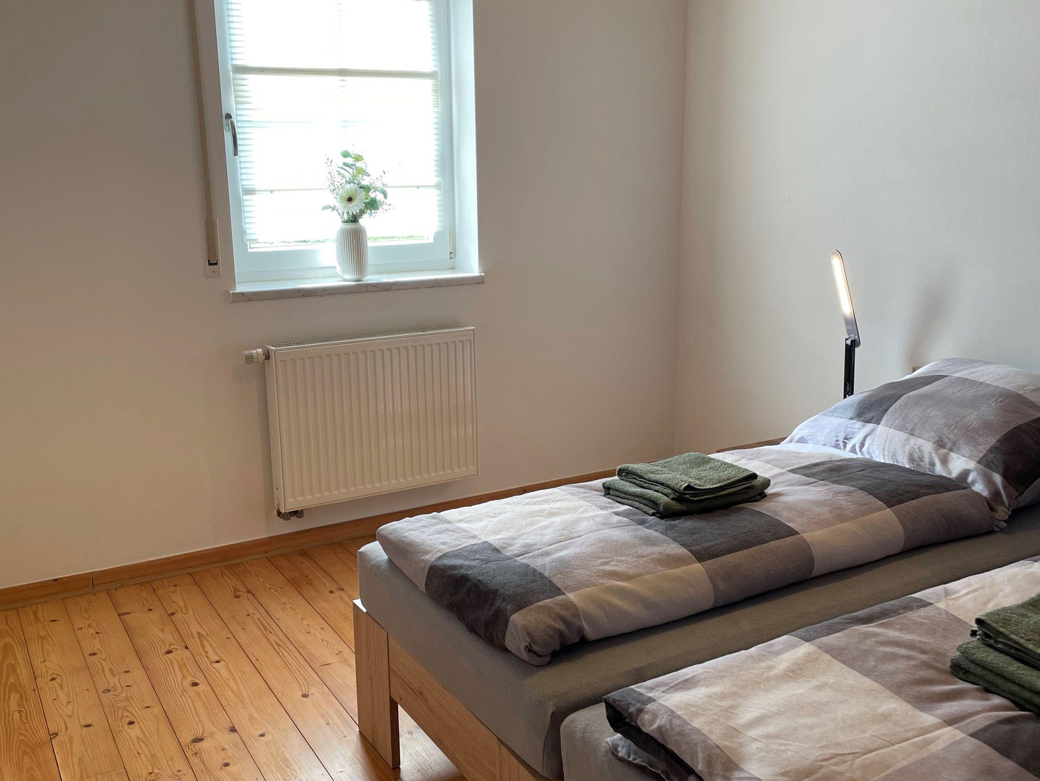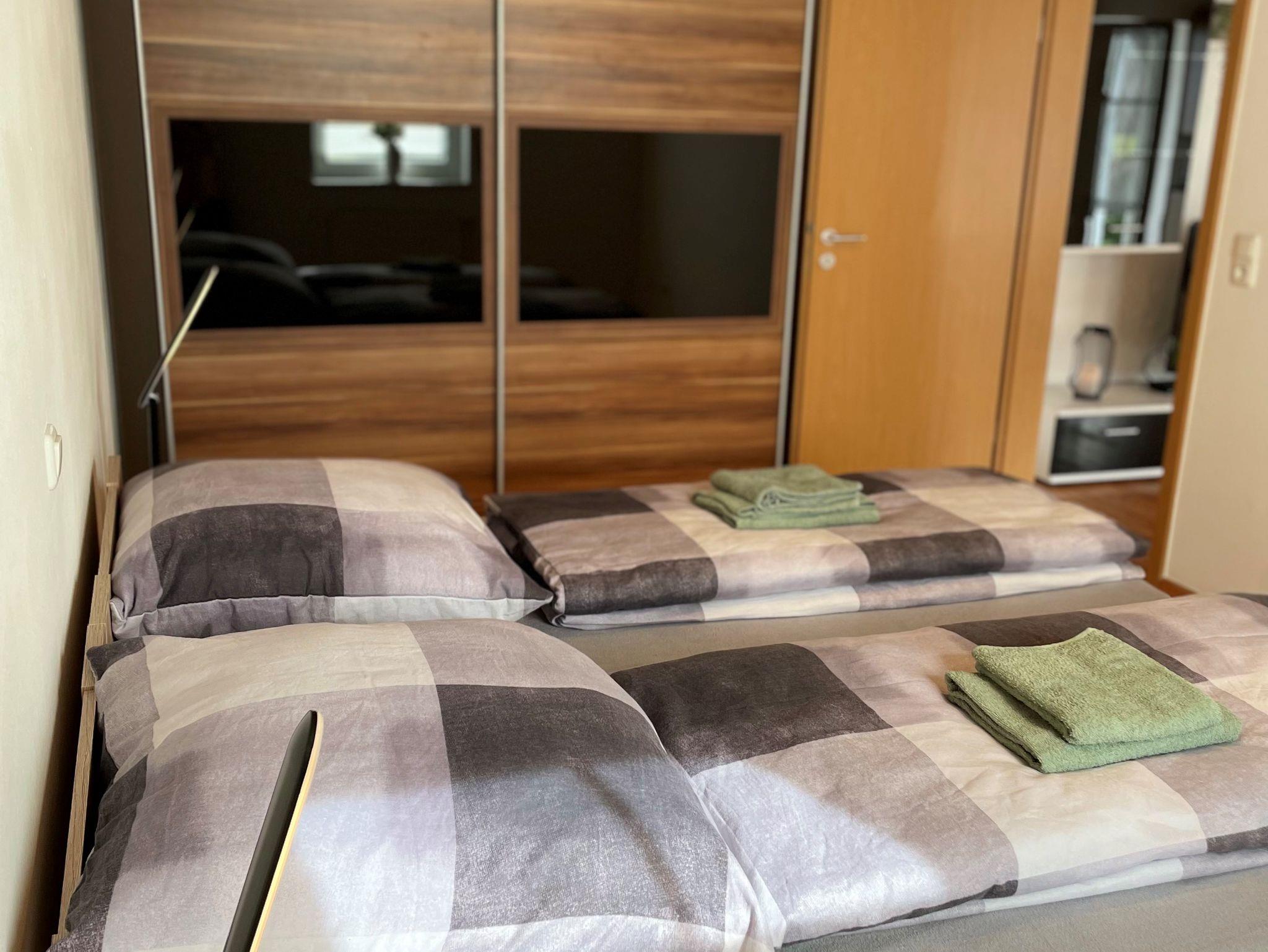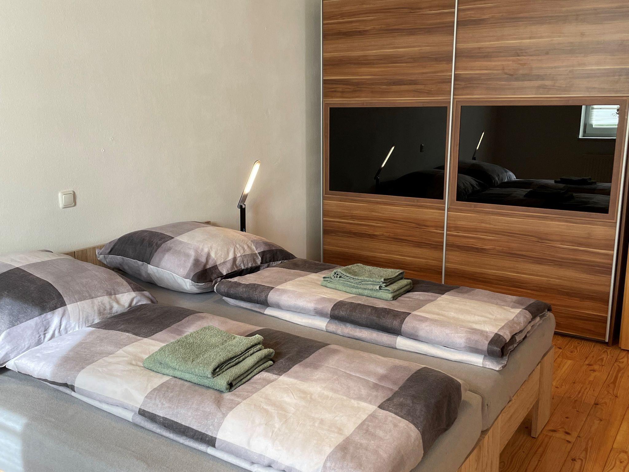 Im gemütlichen Schlafzimmer befindet sich ein Bett mit den Maßen 2mx2m. Die Betten können auch einzel benutzt werden und man hat somit 2 Betten mit je 1m x 2m. Frische Bettwäsche ist hier ebenso inbegriffen.