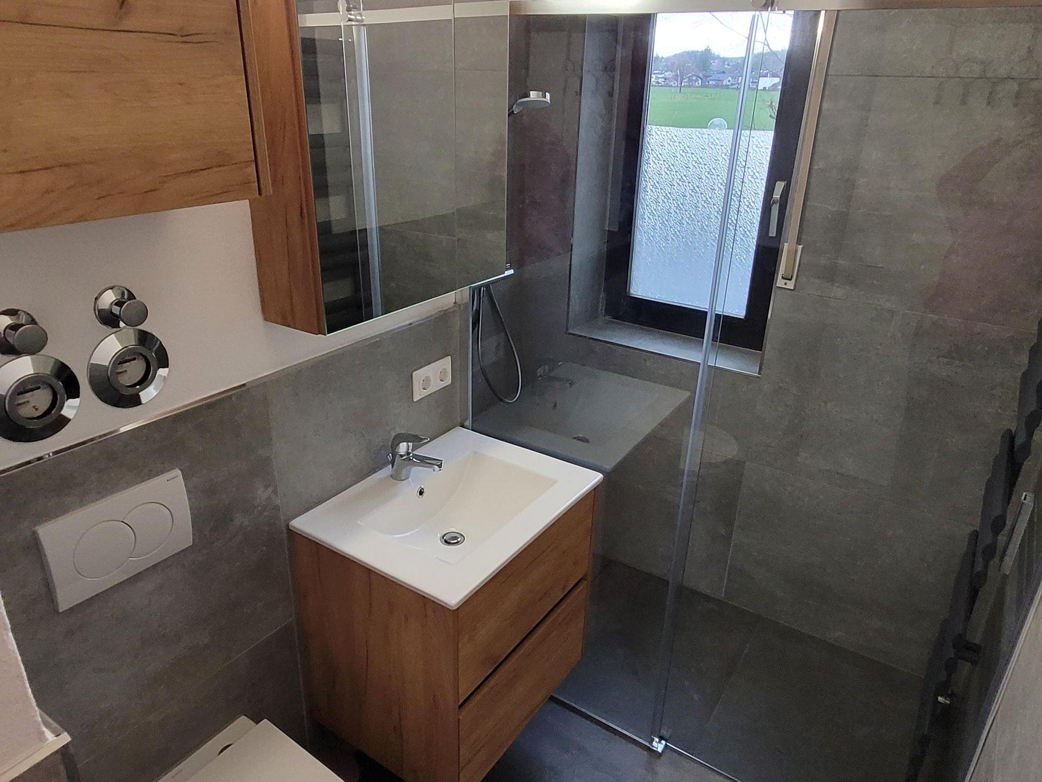 Unser neues Badezimmer ist mit einer bodentiefen, begehbaren Dusche, Toilette und Waschtisch ausgestattet.