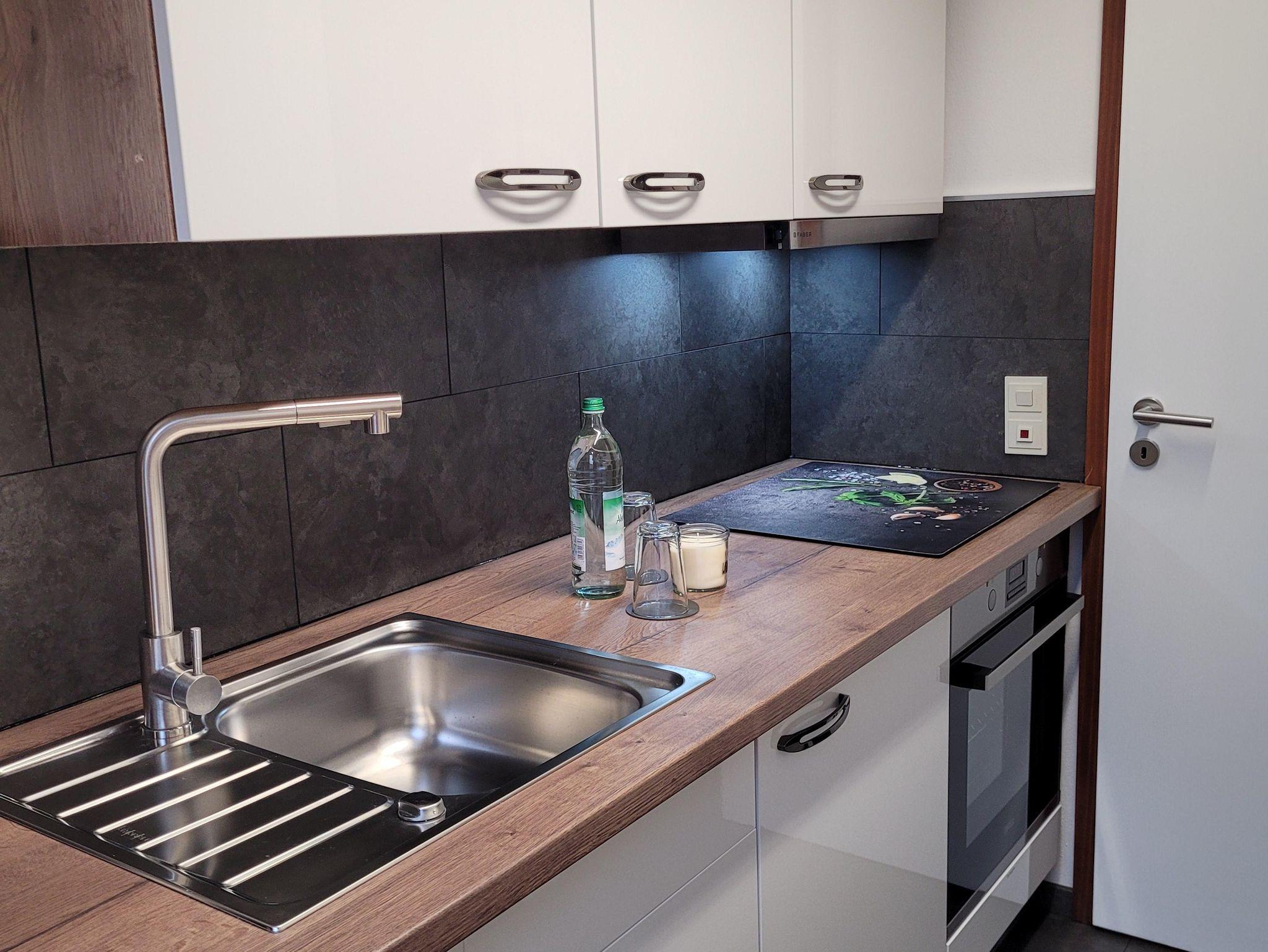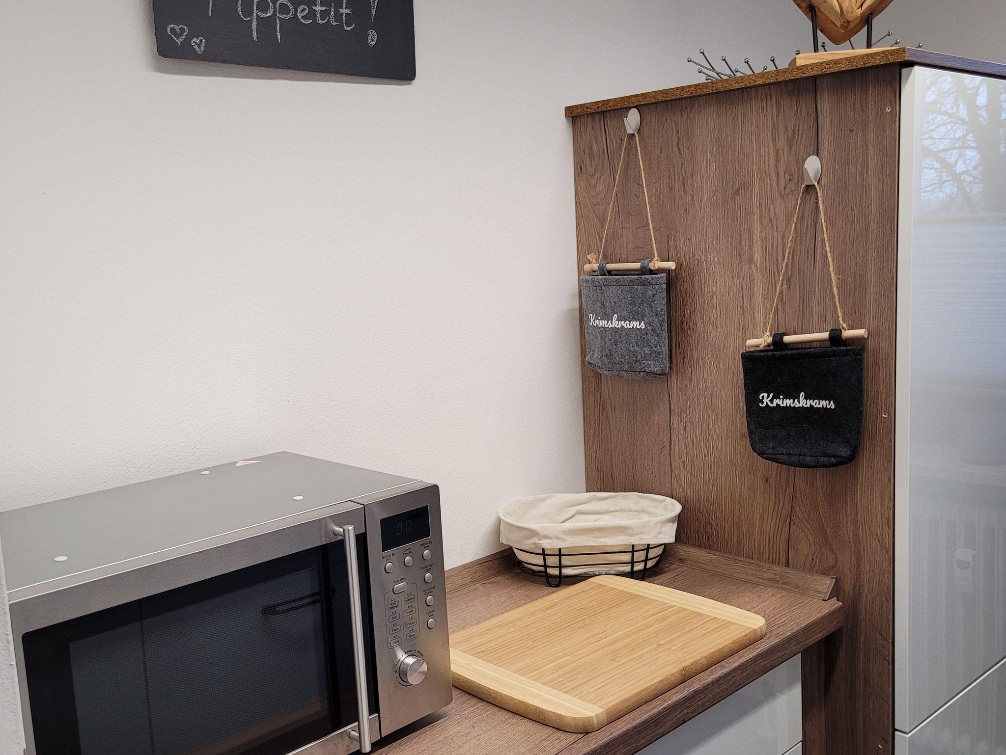 Die Küchenzeile ist mit einer Spülmaschine (Spülmaschinentabs werden gestellt) Ceranfeld, Backofen,Kühlschrank m. Gefrierfach, Mikrowelle, Senseo, Kaffeemaschine, Brita Wasserfilter, Toaster, Eierkocher und Gewürzen voll ausgestattet.