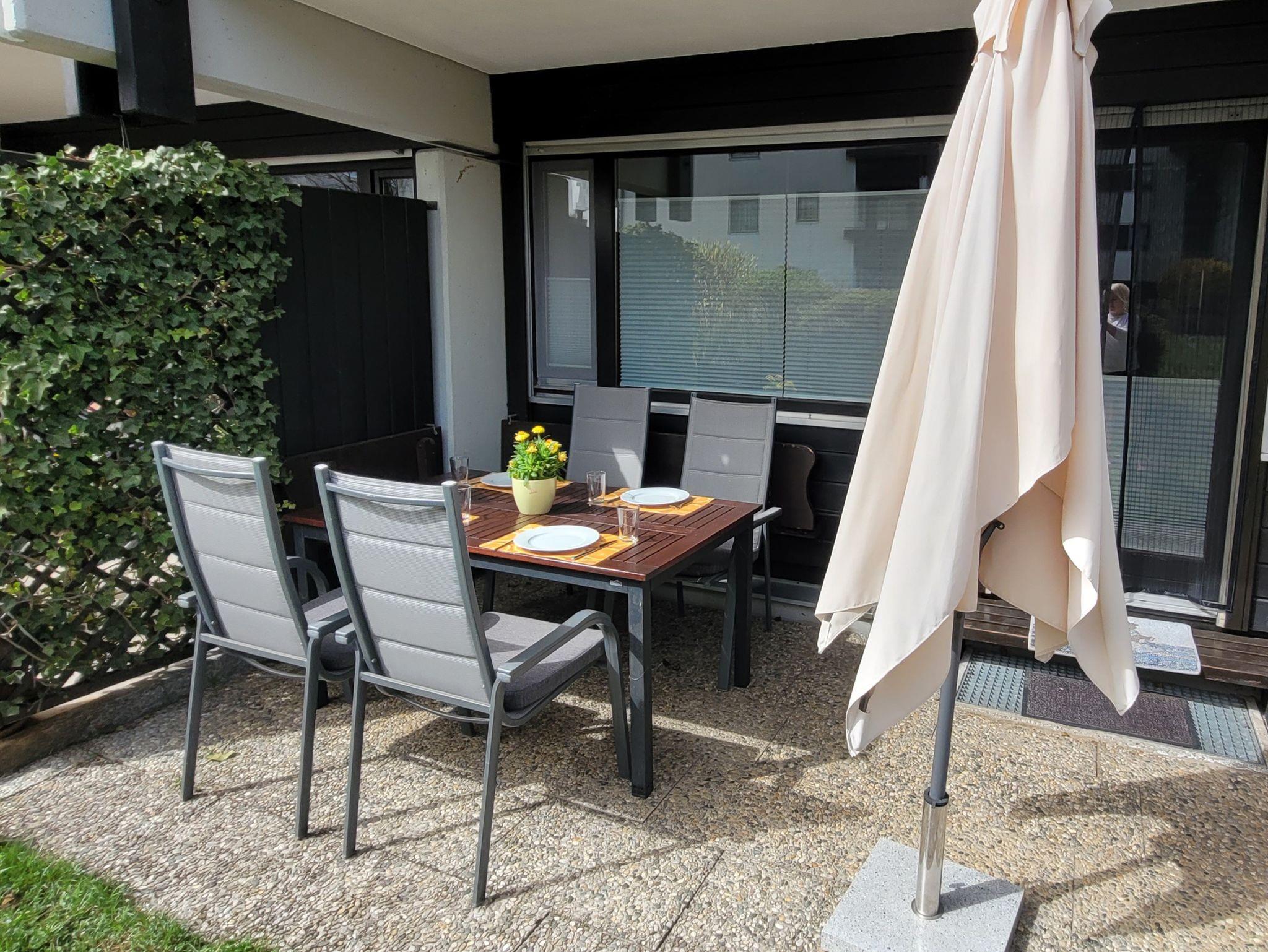Zur Wohnung gehört eine Sonnenterrasse mit großer Bank, Stühlen, Tisch und Sonnenschirm.