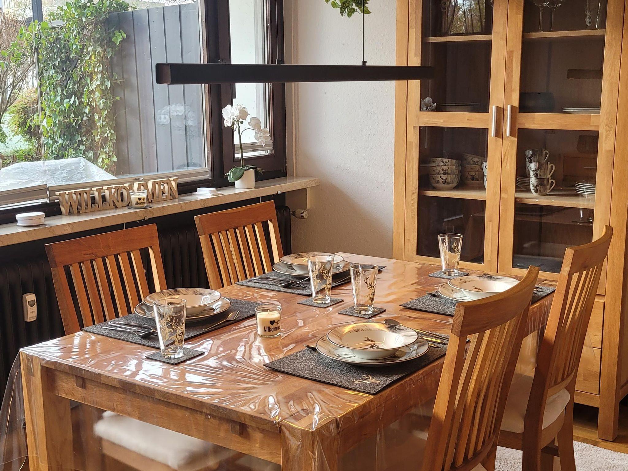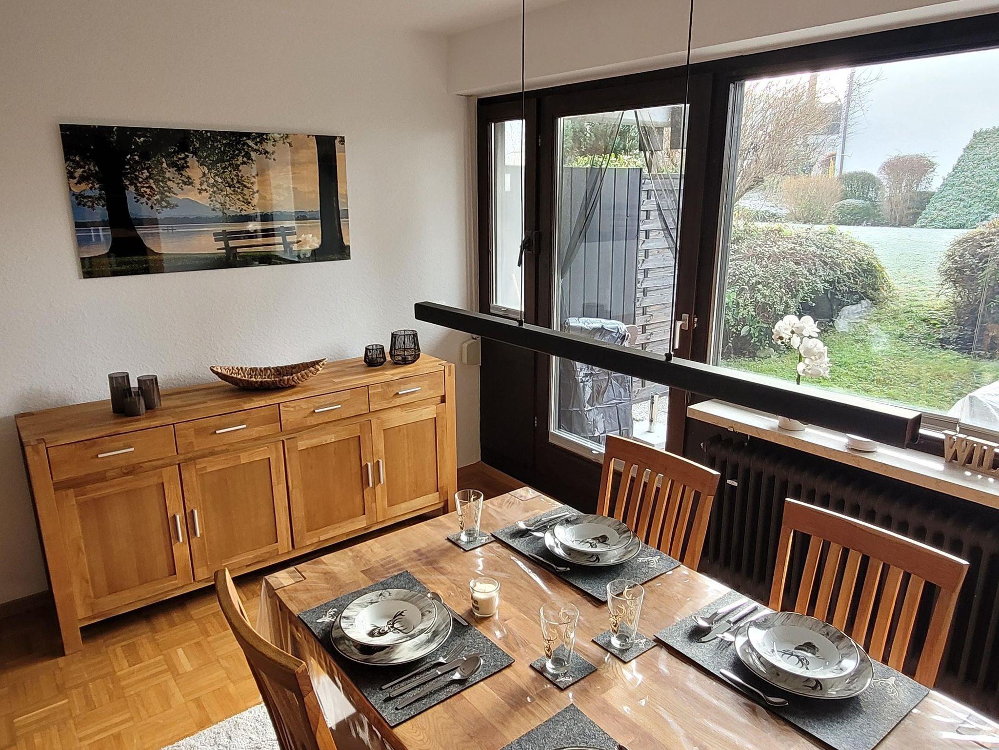 Vom Esszimmertisch mit 4 Stühlen aus, genießen Sie den Blick in den Garten.