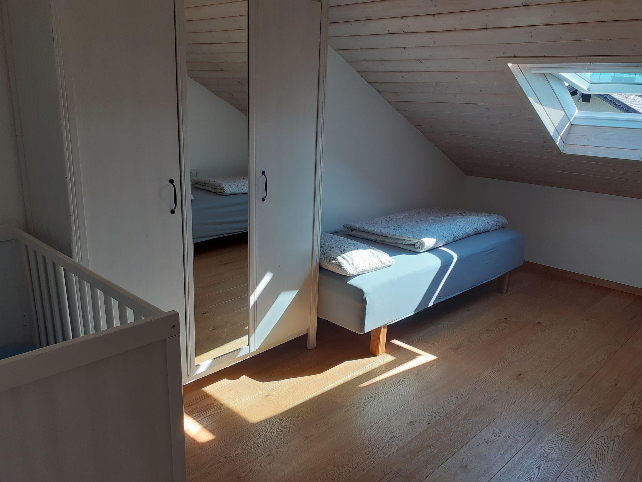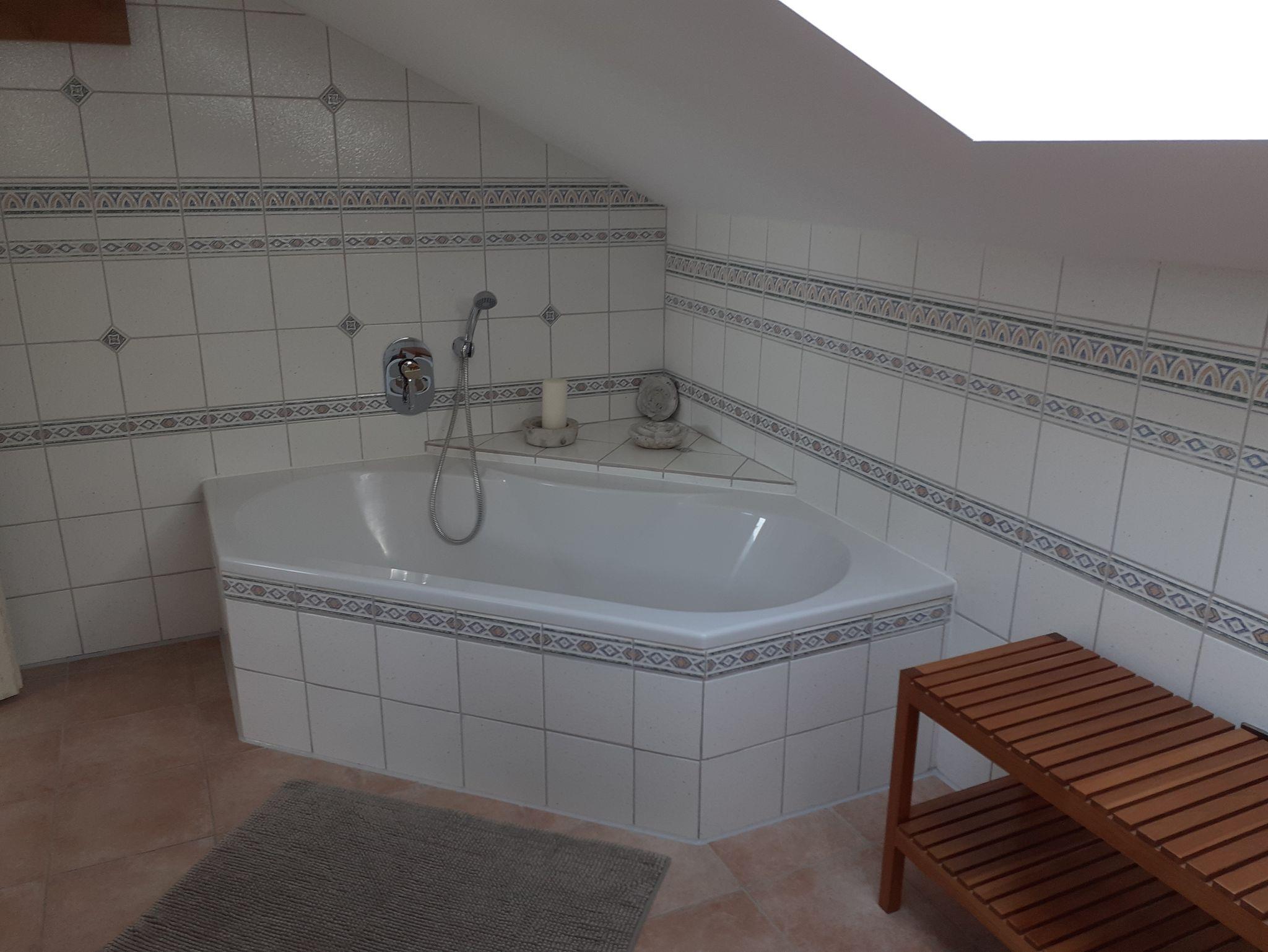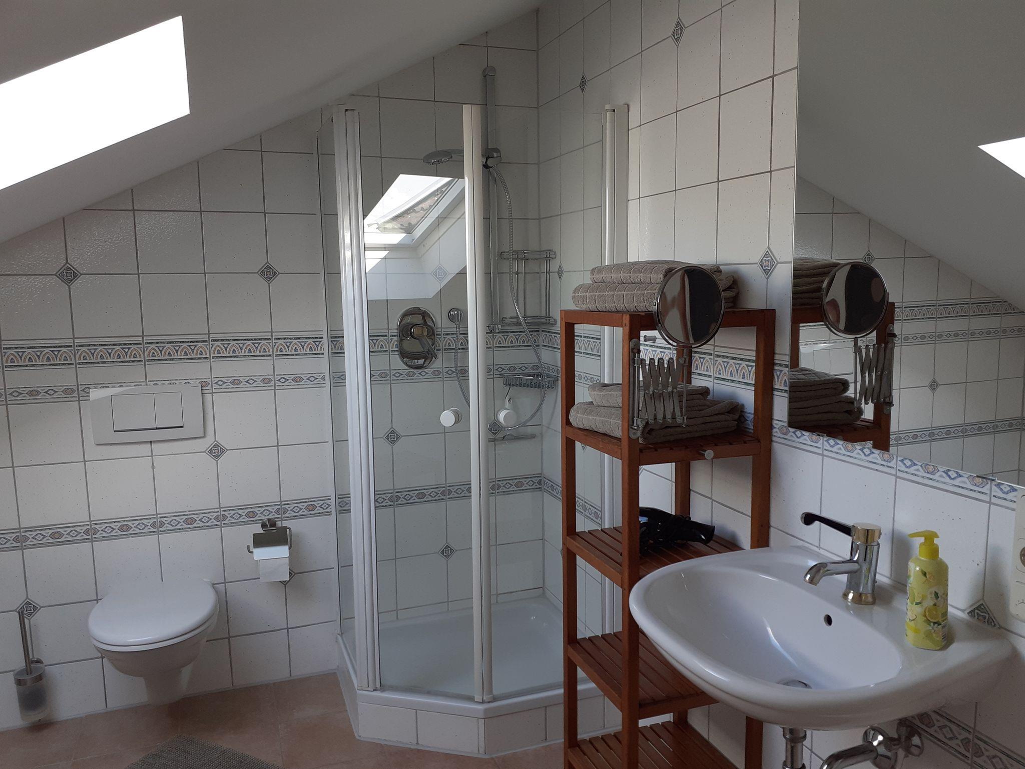 Ohne Dachschräge gemessen 80qm große Ferienwohnung im zweiten Stock (Dachgeschoss), voll ausgestattete Küche mit Spülmaschine, Sat-TV, Bad mit Dusche und Badewanne. Im 1. Schlafzimmer befindet sich ein Doppelbett, Im 2. Schlafzimmer befinden sich zwei Einzelbetten und ein Kinderbett ( bis ca. 2 Jahre). Ein weiteres Kinderbett bis ca. 2 Jahren kann noch bereitgestellt werden. Im Wohnzimmer befindet sich noch ein Doppelbett und ein Kaminofen.Eigener kleiner Balkon. Ganze Wohnung mit Fussbodenheizung. W-Lan vorhanden.