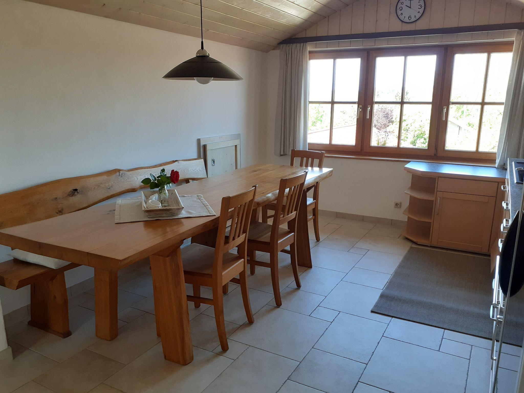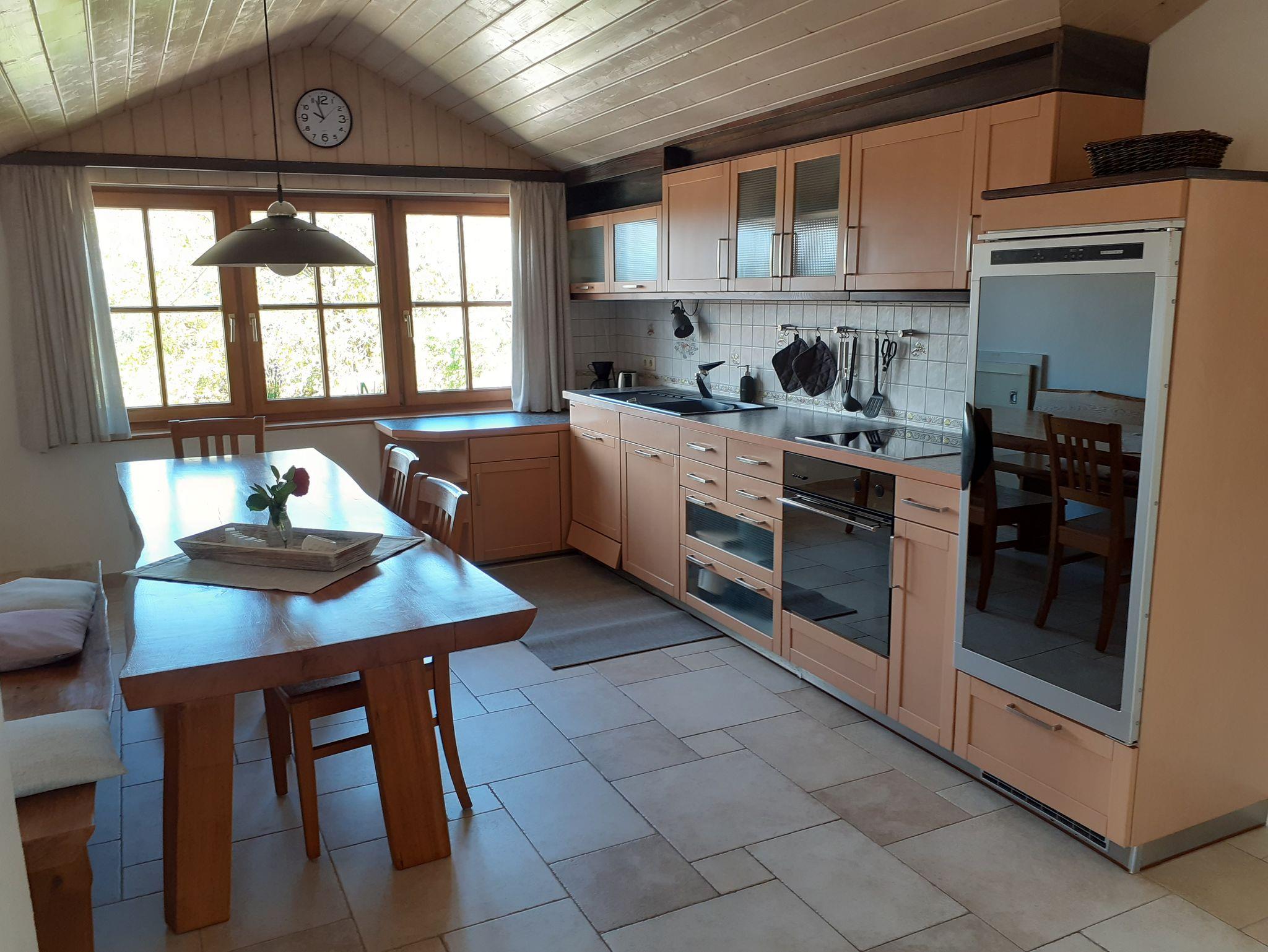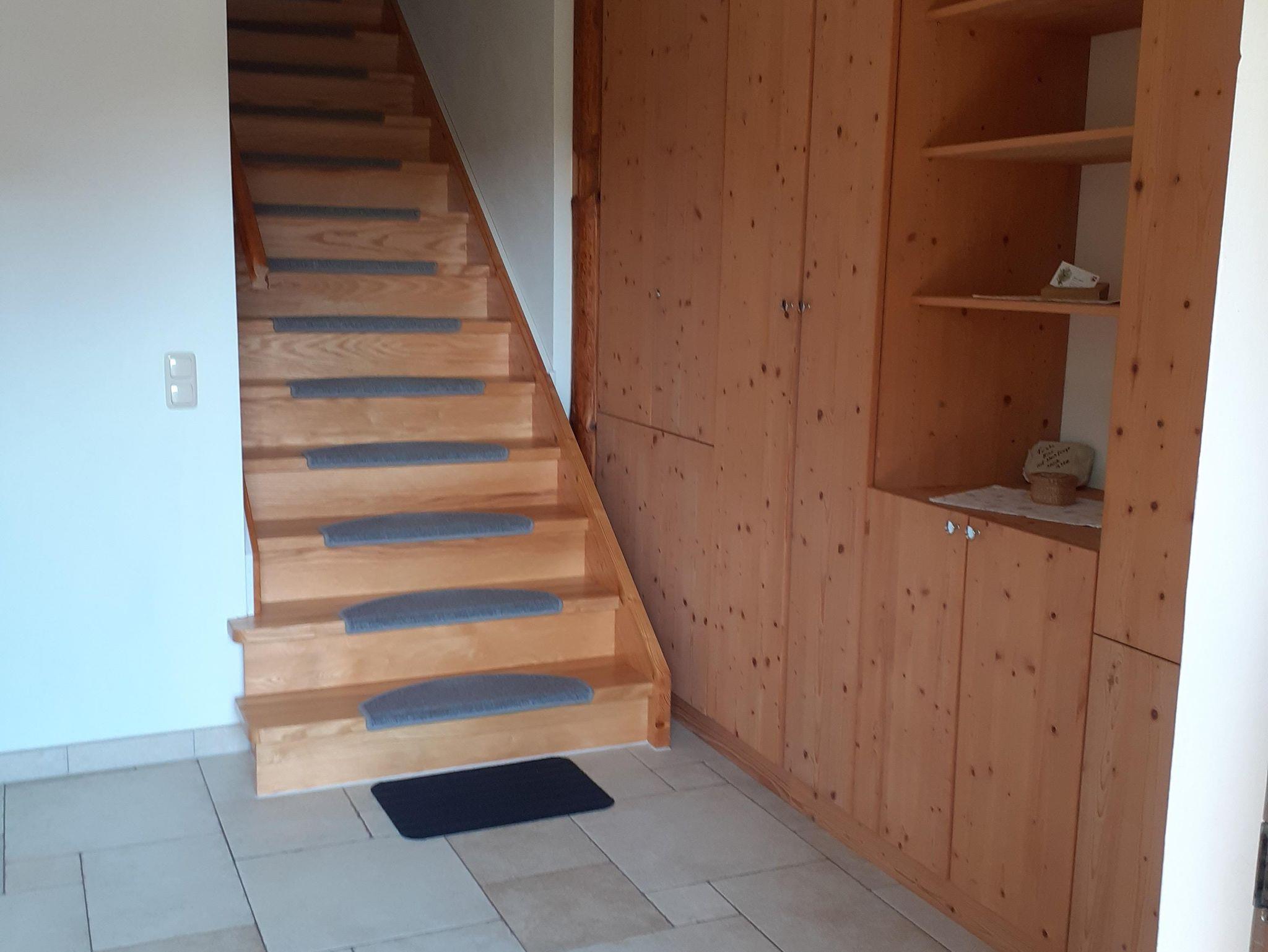 Ohne Dachschräge gemessen 80qm große Ferienwohnung im zweiten Stock (Dachgeschoss), voll ausgestattete Küche mit Spülmaschine, Sat-TV, Bad mit Dusche und Badewanne. Im 1. Schlafzimmer befindet sich ein Doppelbett, Im 2. Schlafzimmer befinden sich zwei Einzelbetten und ein Kinderbett ( bis ca. 2 Jahre). Ein weiteres Kinderbett bis ca. 2 Jahren kann noch bereitgestellt werden. Im Wohnzimmer befindet sich noch ein Doppelbett und ein Kaminofen.Eigener kleiner Balkon. Ganze Wohnung mit Fussbodenheizung. W-Lan vorhanden.