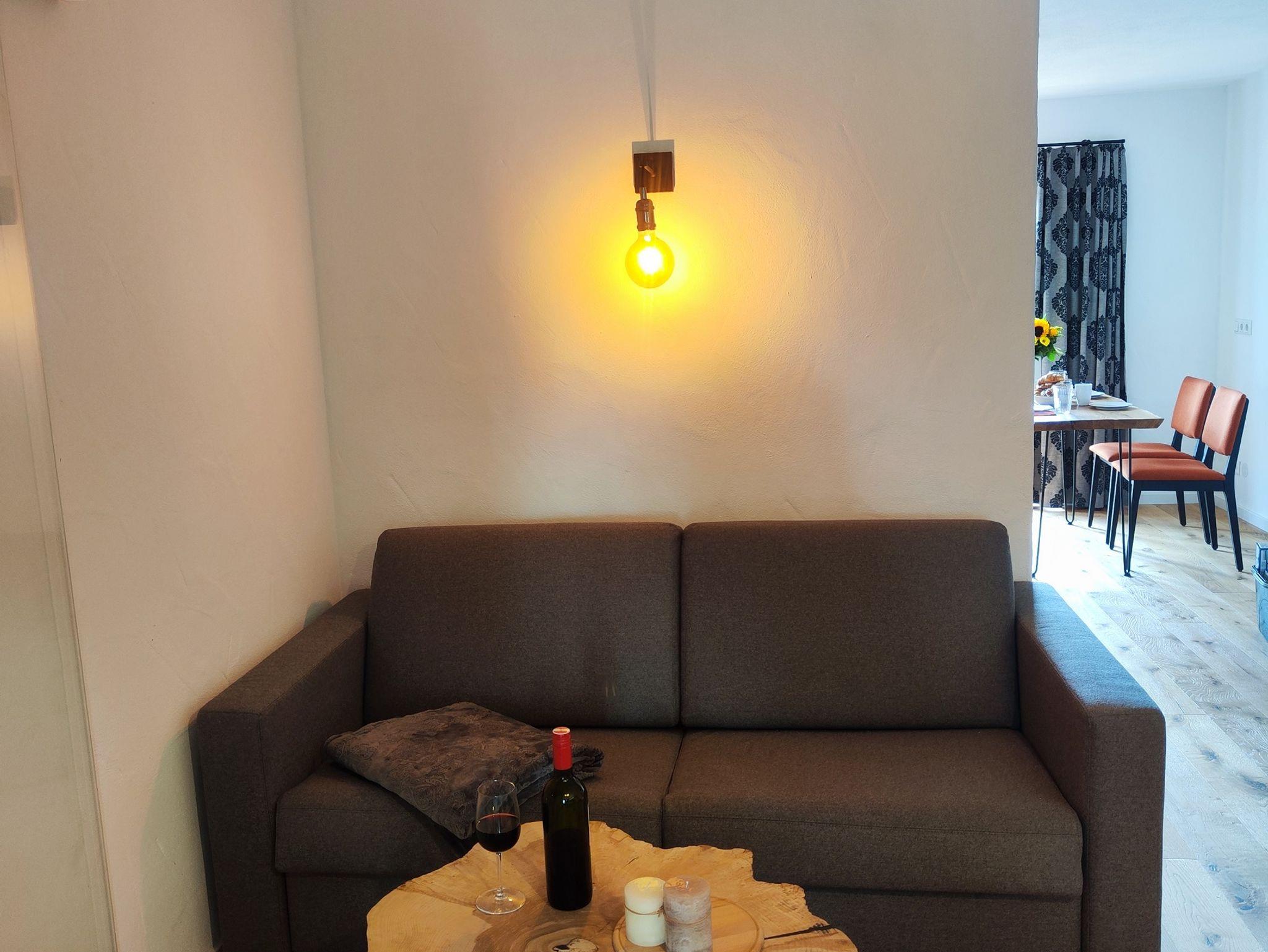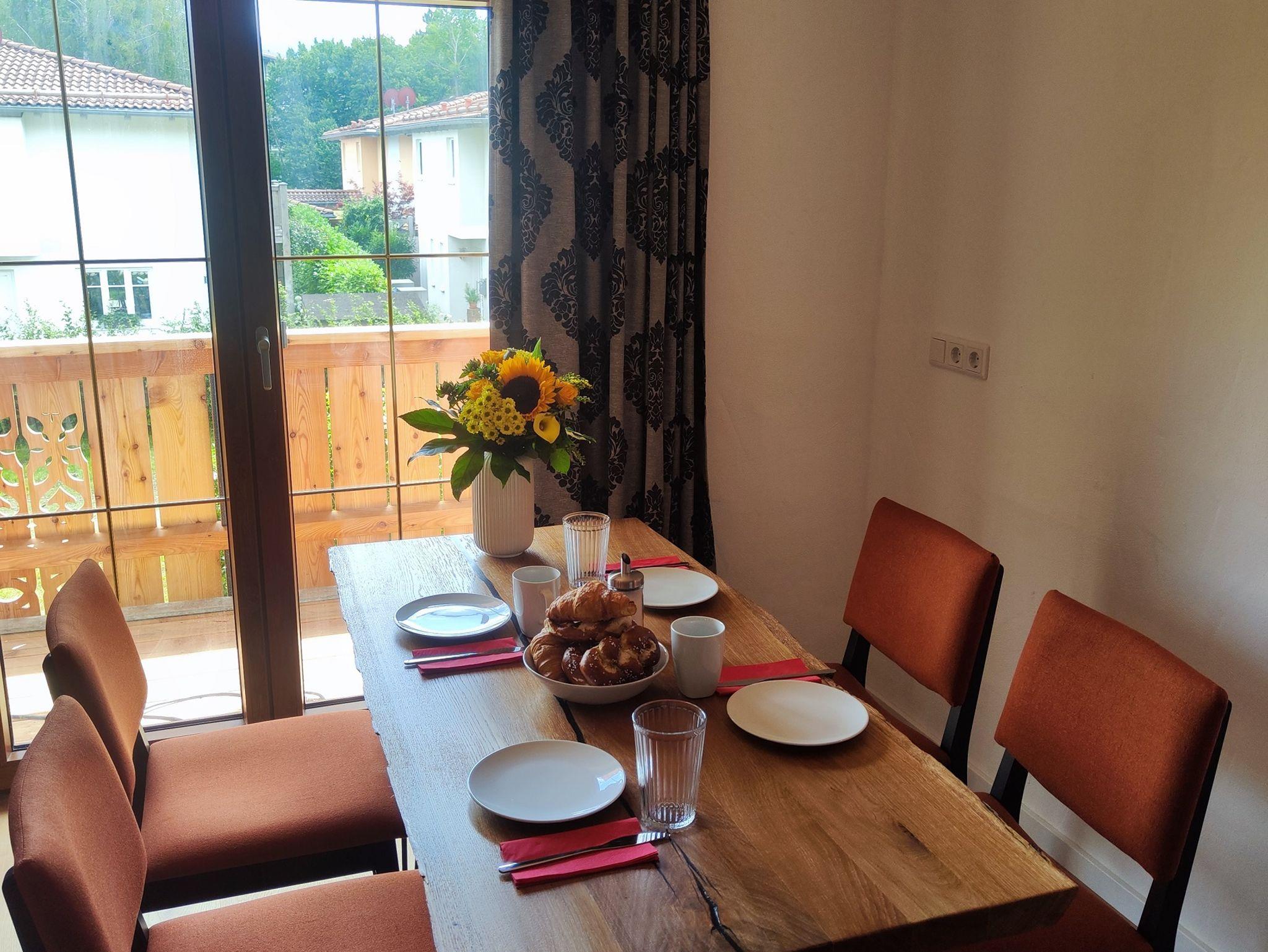 Unsere Ferienwohnung 'Carlotta' verfügt über ein 1,80 Meter Boxspringbett, ein 1,50 Meter (Schlaf-) Sofa, einen Smart-TV, einen Essbereich, eine gut ausgestattete Küche und ein eigenes Bad mit Regendusche und Haartrockner. Handtücher werden gestellt. Ein Geschirrspüler, ein Kühlschrank, ein Backofen, ein Wasserkocher, ein Toaster und eine Kaffeemaschine sind ebenfalls vorhanden. Die Räume sind hell und offen gehalten. Der eigene Balkon ist mit Stühlen und Tisch ausgestattet. Kostenfreies WLAN und Parkplatz steht zur Verfügung, Babybett und Hochstuhl auf Anfrage. Mindestaufenthaltsdauer sind 5 Nächte.