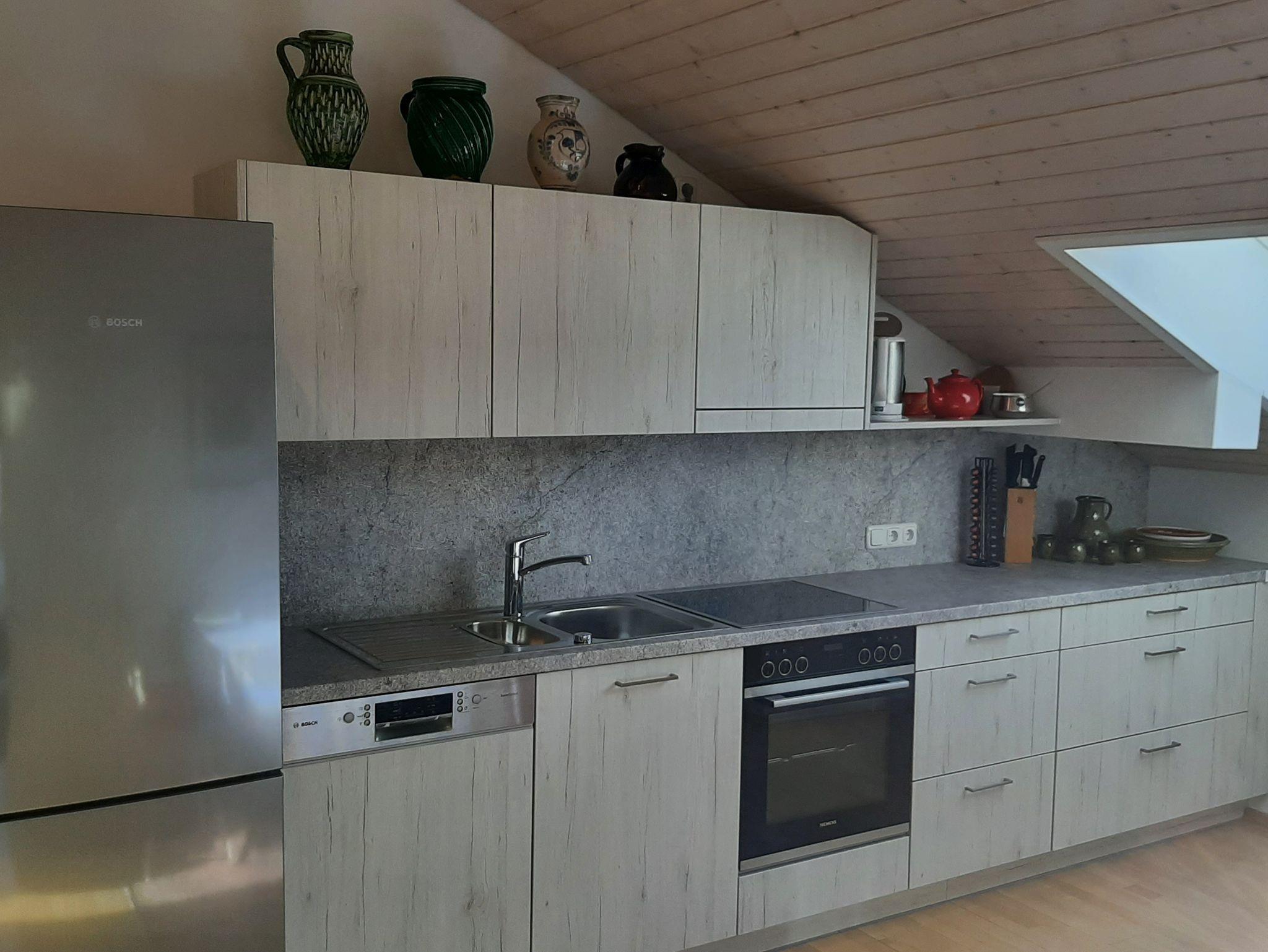 Ausstattungsmerkmale 2 Zimmer-Ferienwohnung mit Wohnküche, 1 Doppelbett (1,60 m), 1 Einzelbett (90 cm) im Wohnzimmer, 1 Bad/WC mit Badewanne, Bettwäsche, Handtücher, Zentralheizung mit Solaranlage, Sat-TV, Metz TV und Smart-TV (49 Zoll) 4K, umfangreiche Küchenausstattung mit Kühlgefrierkombi Bosch, Siemens Herd-Set mit Selbstreinigungsautomatik, Teleskopauszügen und HighSpeedGlaskeramik-Kochfeld, Bosch-Geschirrspülmaschine, DeLonghi Nespresso Kapselmaschine, Toaster, Eierkocher, Digitalradio mit CD Player und Bluetooth Streaming, Fön, Nichtraucher, Dachterrasse, W-LAN, Lage Ferienwohnung im Dachgeschoss.Größe: Wohnfläche 58,05 m²; Dachterrasse 9 m²