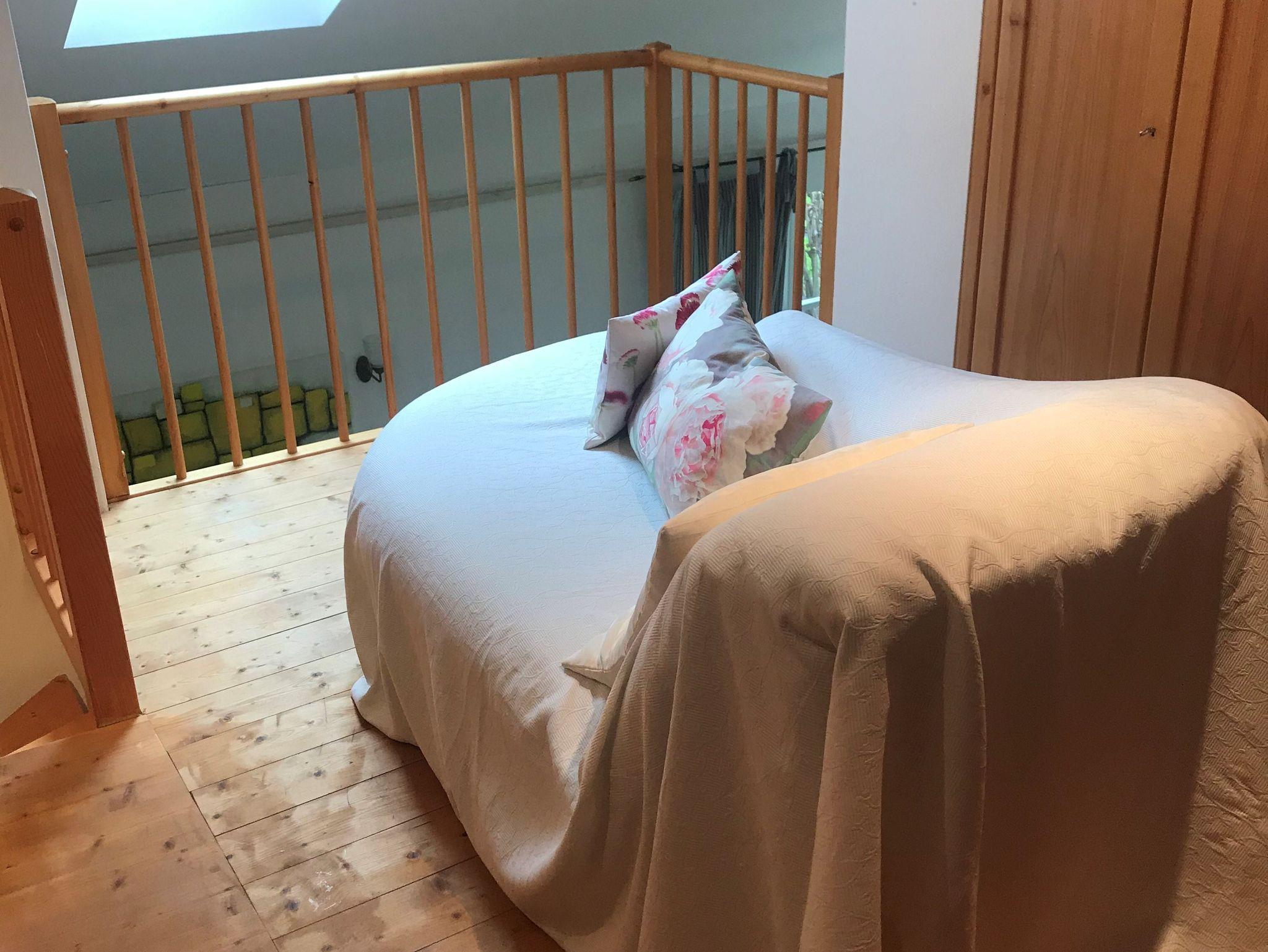 Galerie mit zwei Einzelbetten (ohne Fußteil) und Chaiselongue mit Blick durch das Dachfenster,Wohnzimmer mit TV, komplett ausgestattete Wohnküche mit Geschirrspüler, Bad mit Dusche, WC und Badewanne.
