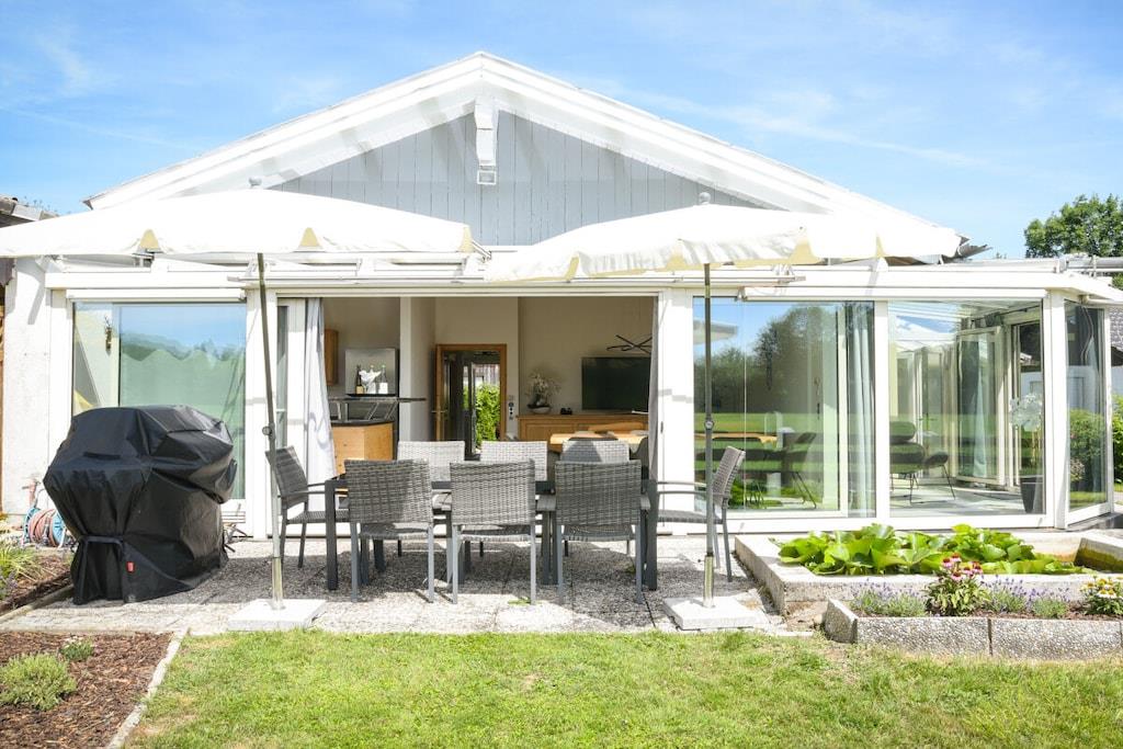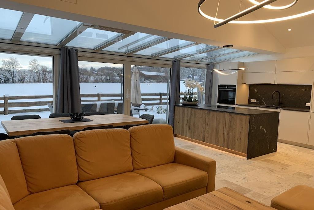 Das Ferienhaus mit Süd-West-Ausrichtung, welches sich direkt am Naturschutzgebiet befindet, bietet Ihnen eine unglaubliche Ruhe und grandiose Aussicht auf die Alpen. Die Terrasse läd mit einen Tischtisch für 8 Personen und 2 Liegen zum Verweilen ein. Das Ferienhaus Bergblick in Prien bietet Ihnen die Möglichkeit mit maximal 5 Personen Erholung zu finden. Verteilt auf 2 Schlafzimmer und einer Schlafcouch im Wohnzimmer. Im Tageslichtbad befindet sich eine bodengleiche Dusche, ein Waschbecken und eine Toilette. Des Weiteren befindet sich eine Gästetoilette mit Waschbecken im Dachgeschoss. Der großzügige Wohnbereich mit Kamin verfügt über einen lichtdurchfluteten Wintergarten mit Esszimmer und Küche und ist im offenen Konzept gestaltet. Im Wohnzimmer befindet sich ein 65" SMART LED UHD TV. Ein Büro mit Schreibtisch und Internet sowie Telefonflatrate in alle EU-Länder steht Ihnen ebenso zur Verfügung. Großzügige Außenterrasse mit einem Weber-Gasgrill, einen Esstisch für 8 Personen und 2 Liegen. Mehr finden Sie auf unserer Homepage.