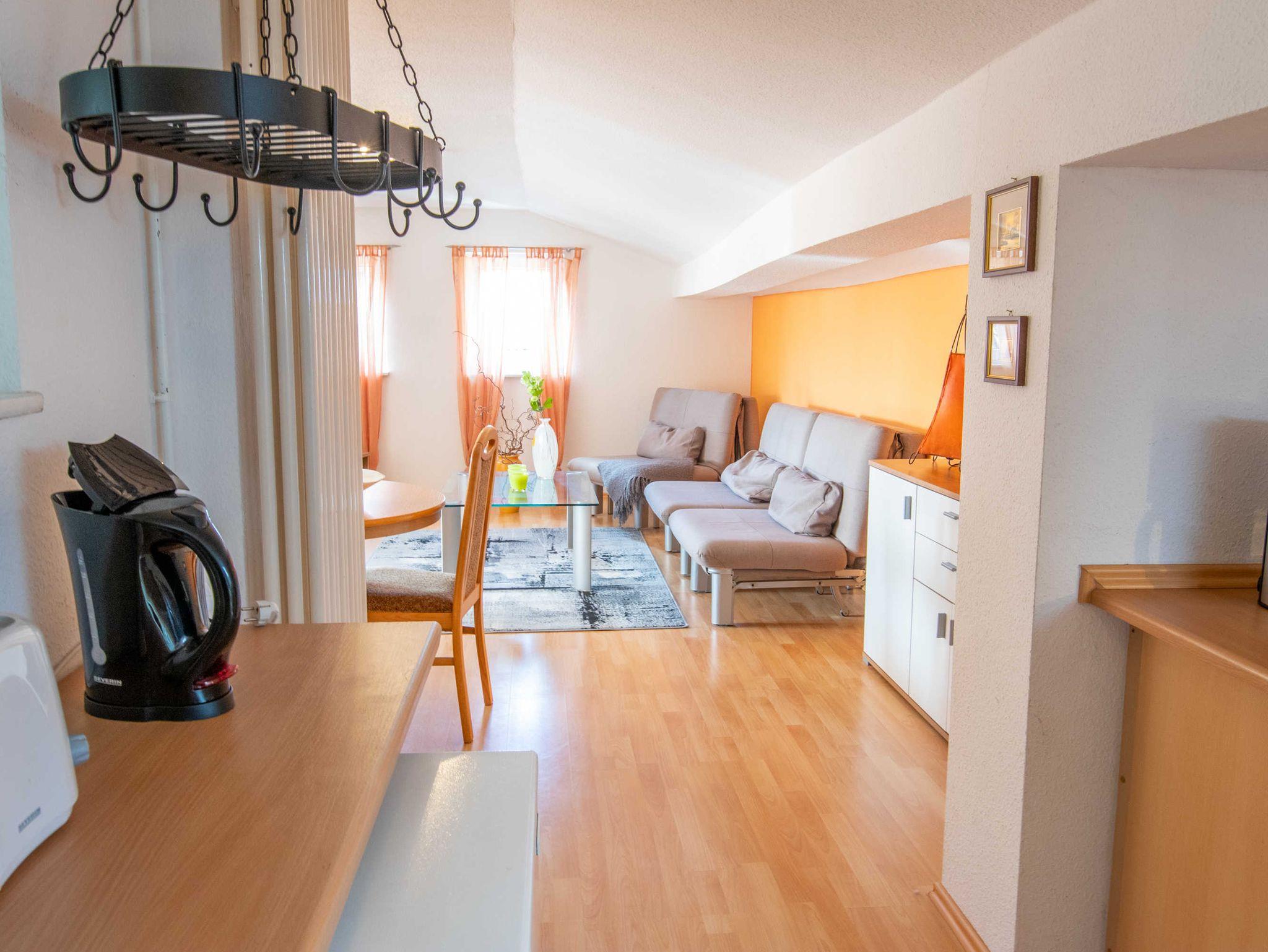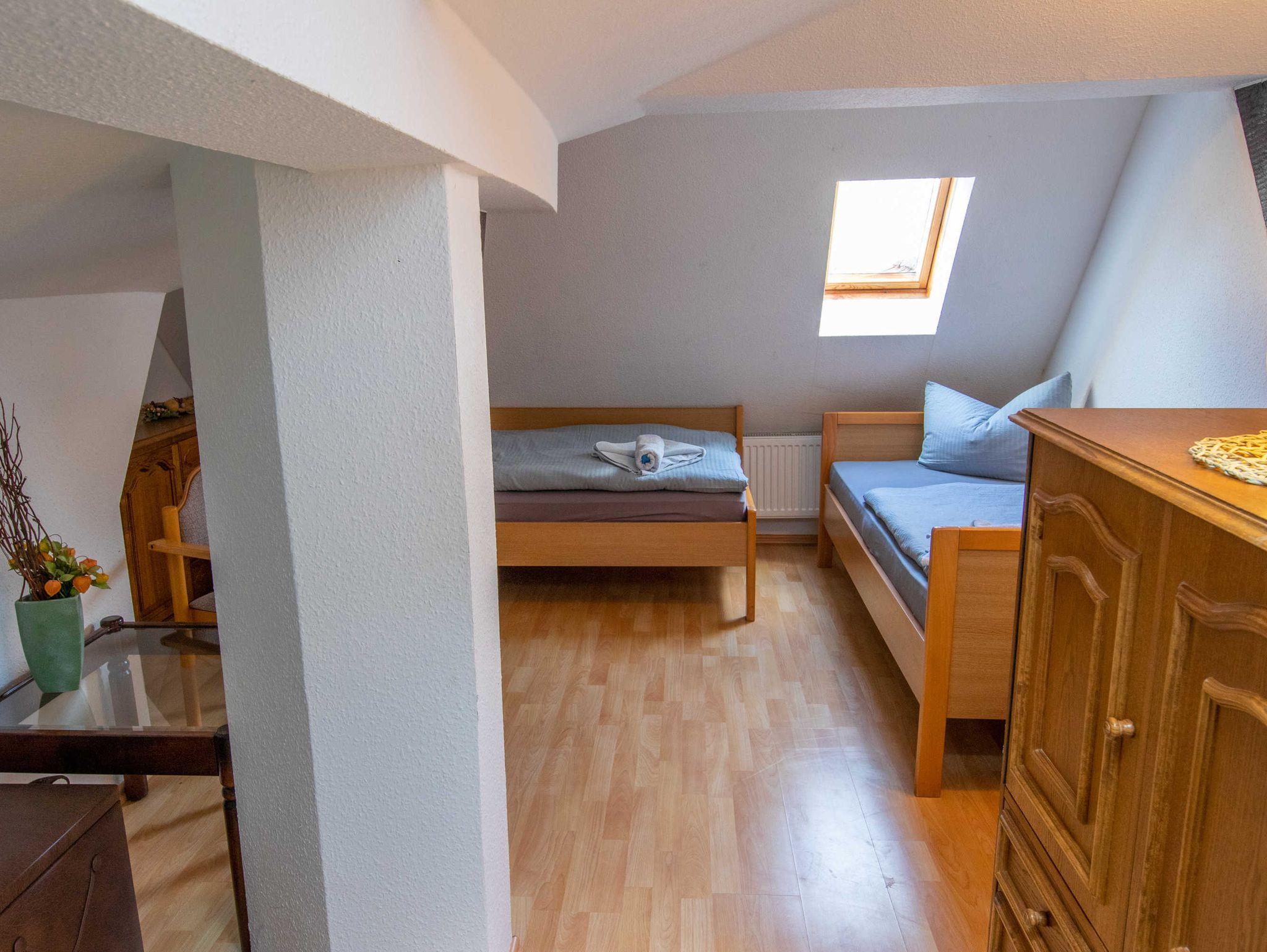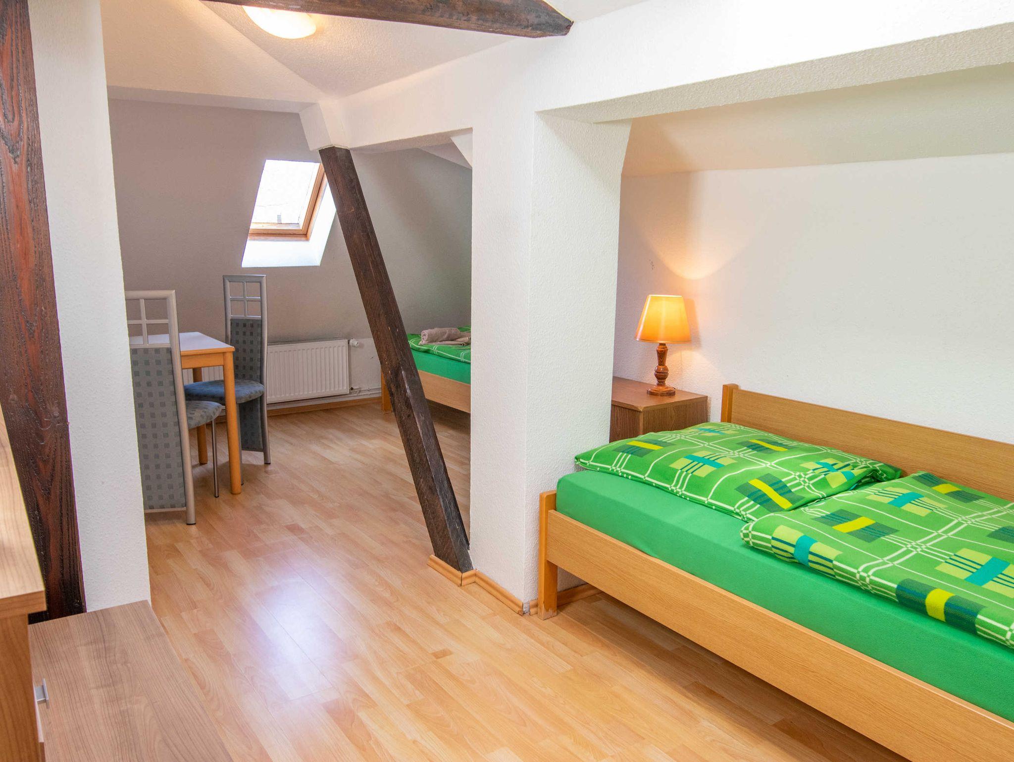 Die 65m² große 3-Raumwohnung für bis zu 5 Personen befindet sich im Dachgeschoss der Pension und ist über 2 Treppen zu erreichen.