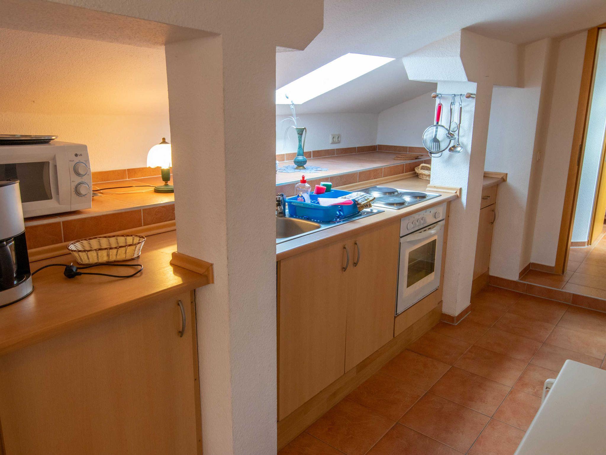 Die Ferienwohnung ist gemütlich eingerichtet - Laminatfußboden und helle, freundliche Farben und Dachschrägen charakterisieren diese Ferienwohnung. Im Wohnzimmer mit offener, voll ausgestattetter Küche und Essbereich, stehen drei Schlafsessel und ein Flachbild-TV, sowie eine weitere Schlafmöglichkeit (Einzelbett, 90x200) zur Verfügung. Vom Flur aus sind die beiden Schlafzimmer mit jeweils zwei Einzelbetten (90x200) zugänglich. Weiterhin gibt es ein kleines helles Bad mit Dusche und WC.